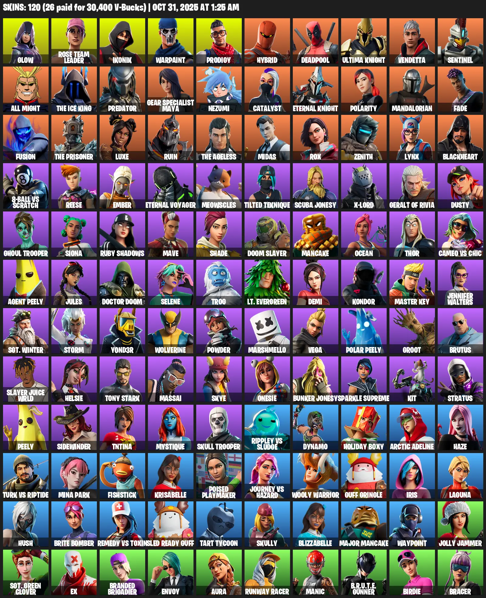 {PC}120 Skins | OG STW | IKONIK | Glow | Gold Brutus | Gold Midas | Prodigy | Tart Tycoon | Eternal Knight | Gear Specialist | 250 VB