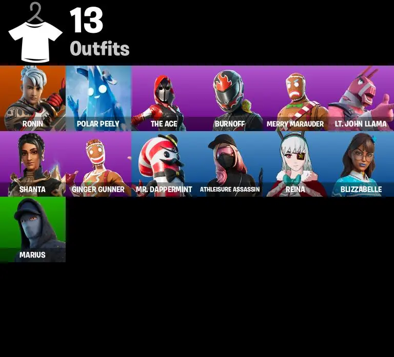 【PC/NS/XBOX 12 skins 🔥 Ronin 🔥 Polar Peely 🔥 Shanta 🔥 Lt. John Llama 🔥 The Ace 🔥 Ginger Gunner 🔥 Merry Marauder 🔥 Reina 🔥 Mr. Dappermint 🔥 0 VB