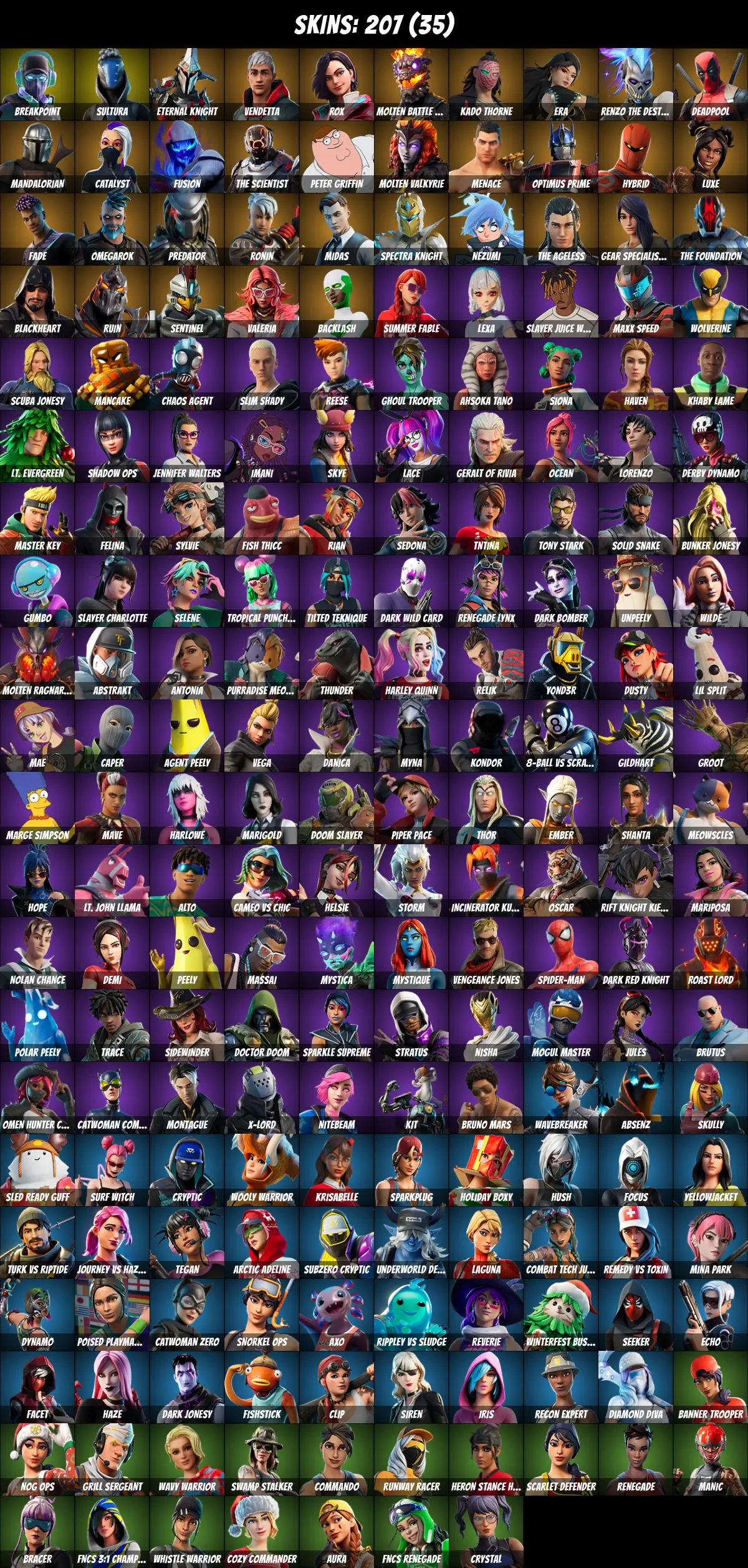 ⚡PC/PSN/XBOX⚡ 207 skins 💎 Ghoul Trooper 💎 Backlash 💎 Deadpool 💎 Harley Quinn 💎 Tony Stark 💎 Catwoman Comic Book Outfit 💎 Midas 💎 Surf Witch 💎 Mandalorian 💎 Jules 💎 Fishstick 💎 Aura 💎 Peely 💎 Agent Peely 💎 Spider-Man 💎 Breakpoint 💎 Sultura 💎 1300 V-Bucks 💎