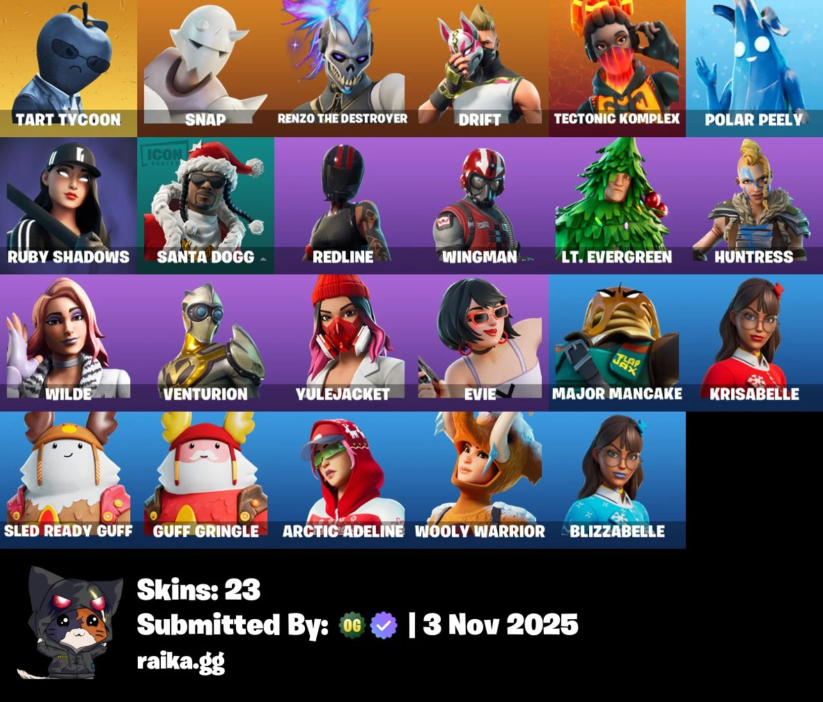 [PC/PSN/XBOX] 23 skins | Tart Tycoon | Take The Elf | Snap | Renzo the Destroyer | Drift | Tectonic Komplex | Polar Peely | Ruby Shadows | Santa Dogg | Redline | Wingman | 950 VB