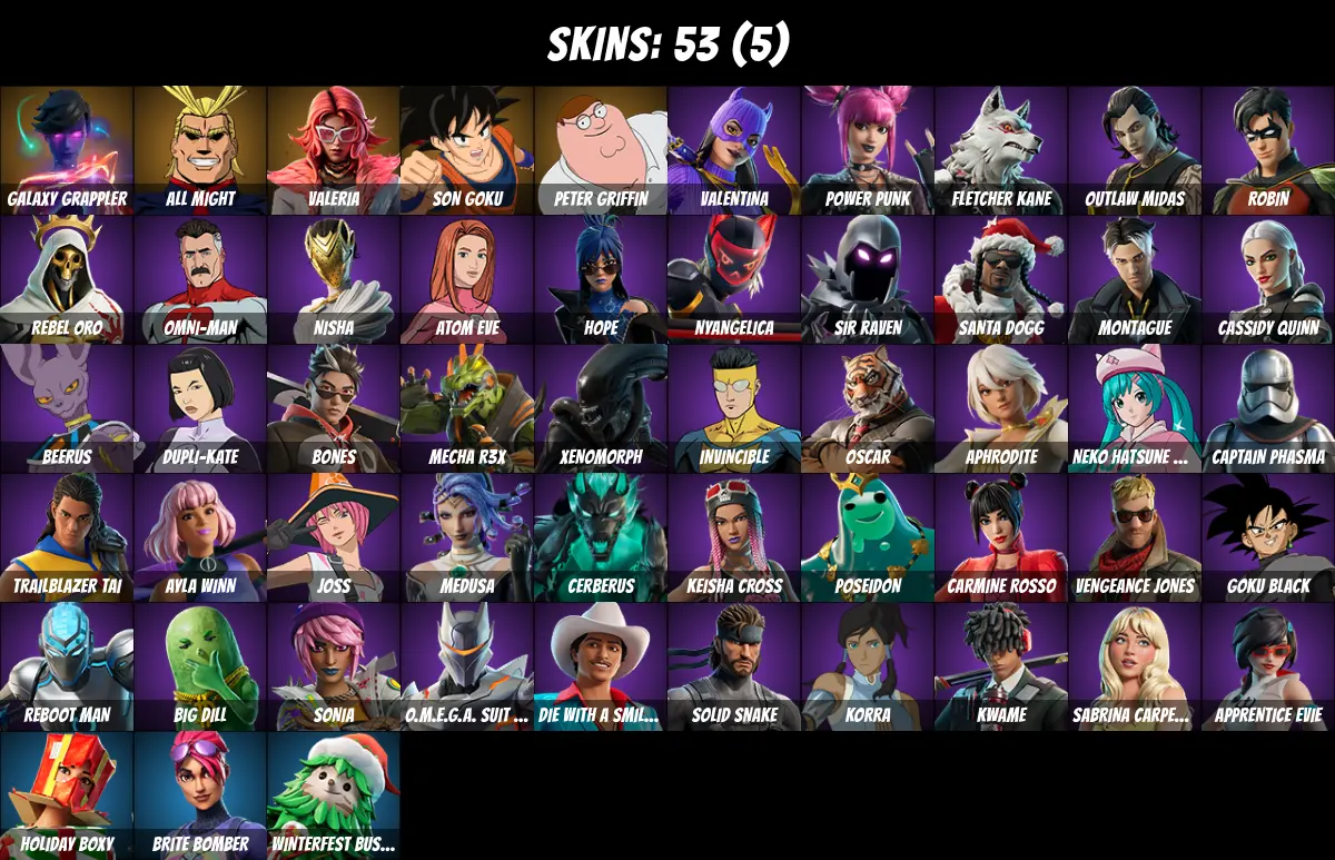 ⚡PC/PSN/XBOX⚡ 53 skins 💎 Son Goku 💎 Beerus 💎 Peter Griffin 💎 Poseidon 💎 Valeria 💎 All Might 💎 Galaxy Grappler 💎 Time Brella 💎 Red Robin's Wings 💎 Valentina 💎 Power Punk 💎 Fletcher Kane 💎 Outlaw Midas 💎 Robin 💎 Rebel Oro 💎 Omni-Man 💎 Nisha 💎 0 V-Bucks 💎