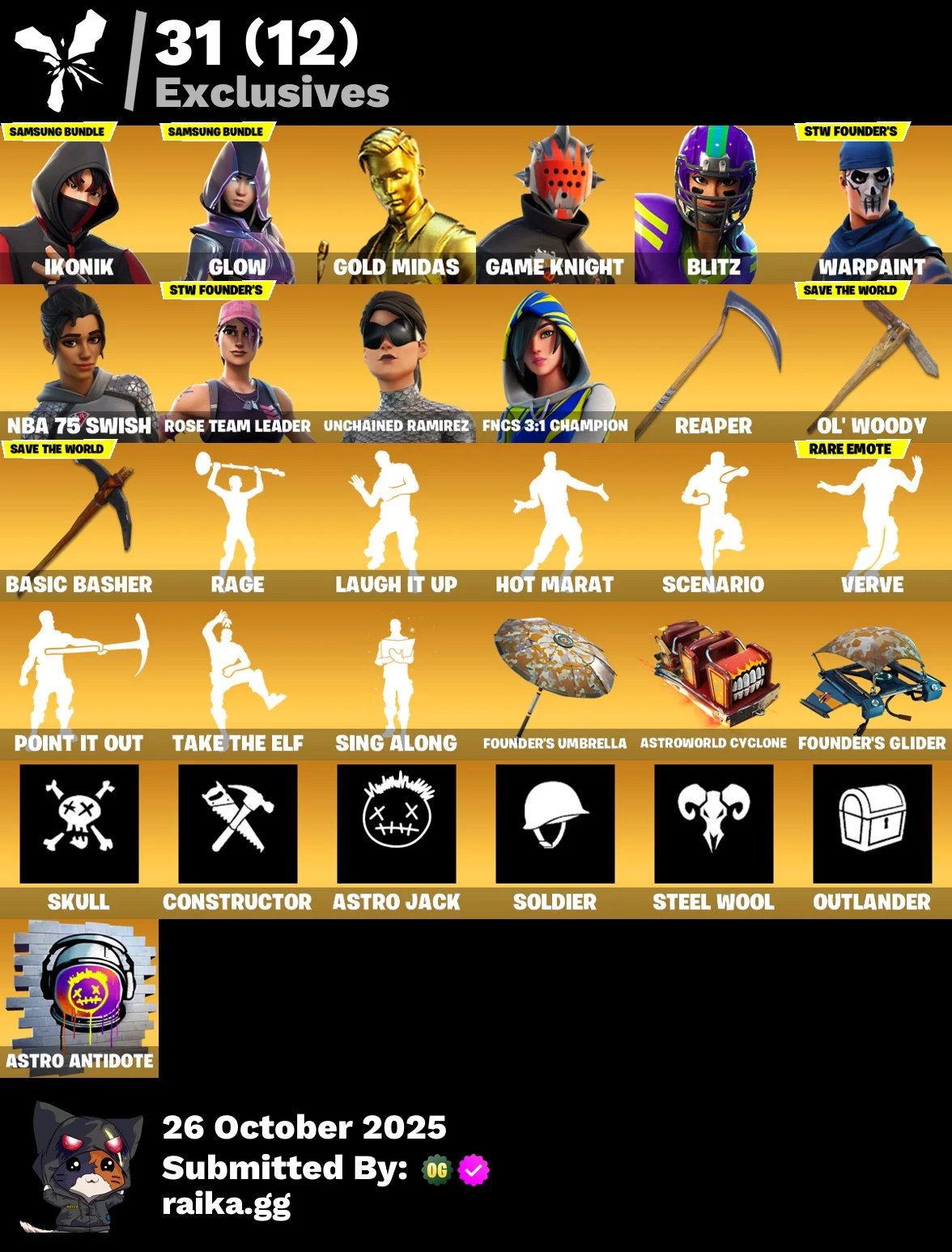 PC/PSN/Xbox/Nintendo 162 skins | OG STW | IKONIK | Unchained Ramirez | Glow | Gold Midas | Game Knight | Blitz | NBA 75 Swish | FNCS 3:1 Champion | Eternal Knight | 200 VB