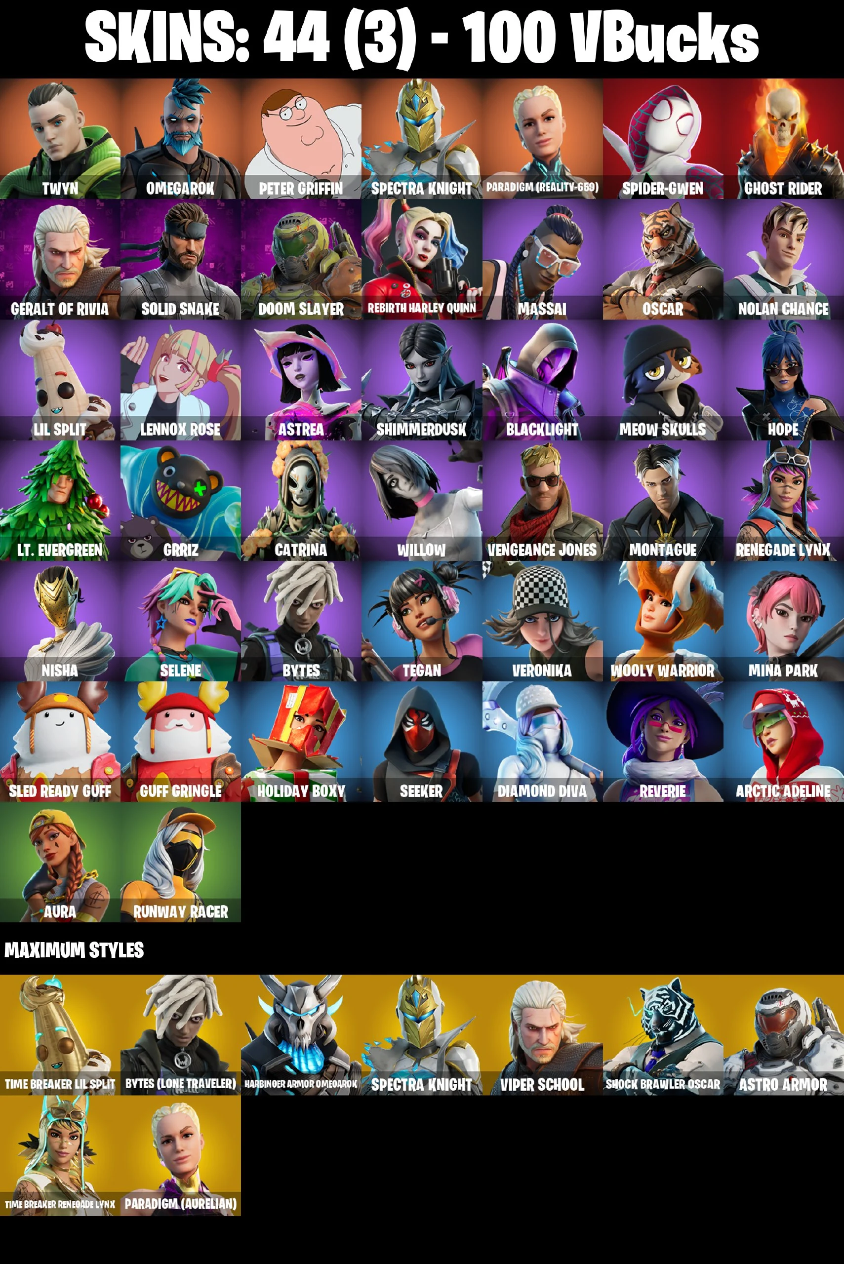 ⭐ [PC/PSN/XBOX/NINTENDO/MOBILE] 44 SKINS | SPIDER-GWEN | SPECTRA KNIGHT | OMEGAROK | GHOST RIDER | REBIRTH HARLEY QUINN | BLACKLIGHT | SOLID SNAKE | GERALT OF RIVIA | CATRINA | MEOW SKULLS | RENEGADE LYNX | ASTREA | NISHA | WILLOW | 100 VBUCKS | EMAIL