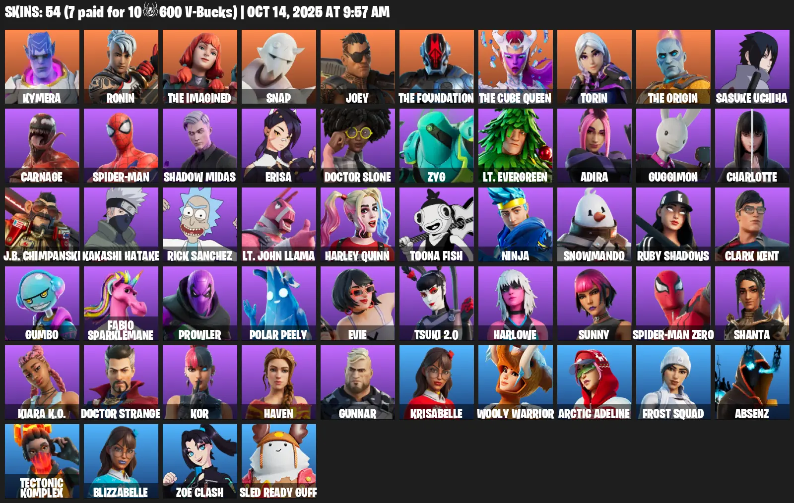 [PC/XBOX] 54 Skins | Kymera | Ronin | The Imagined | Snap | Joey | The Foundation | The Cube Queen | Torin | The Origin | Sasuke Uchiha | Carnage | Spider-Man | Shadow Midas | Erisa | Doctor Slone | Zyg | Lt. Evergreen | Adira | Guggimon | Charlotte