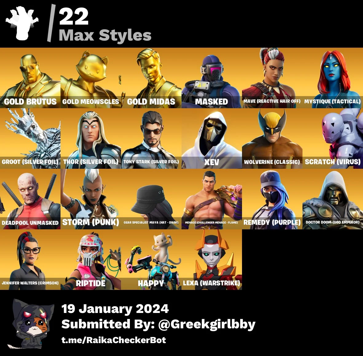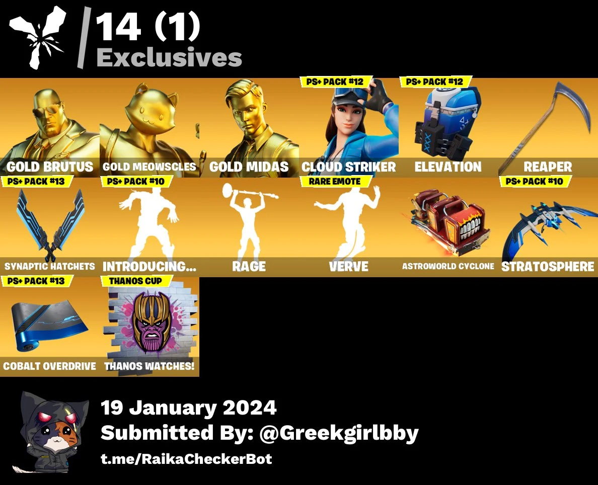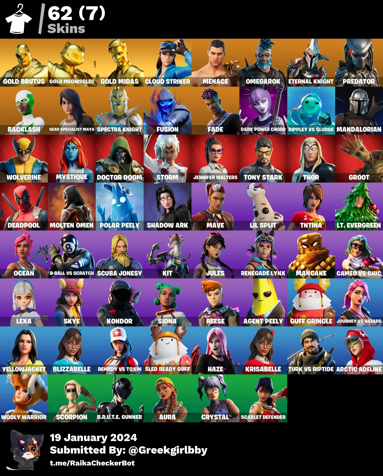 [PC/XBOX] 62 skins | Gold Brutus | Gold Meowscles | Gold Midas | Cloud Striker | YellowJacket | Omegarok | Mail Guarantee