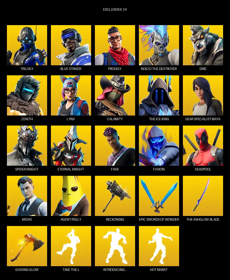 [PC/XBOX] | 73 skins | Take The L | Trilogy | Blue Striker | Prodigy | Renzo the Destroyer | Dire | Zenith | Lynx | Calamity | The Ice King | #UHY7567