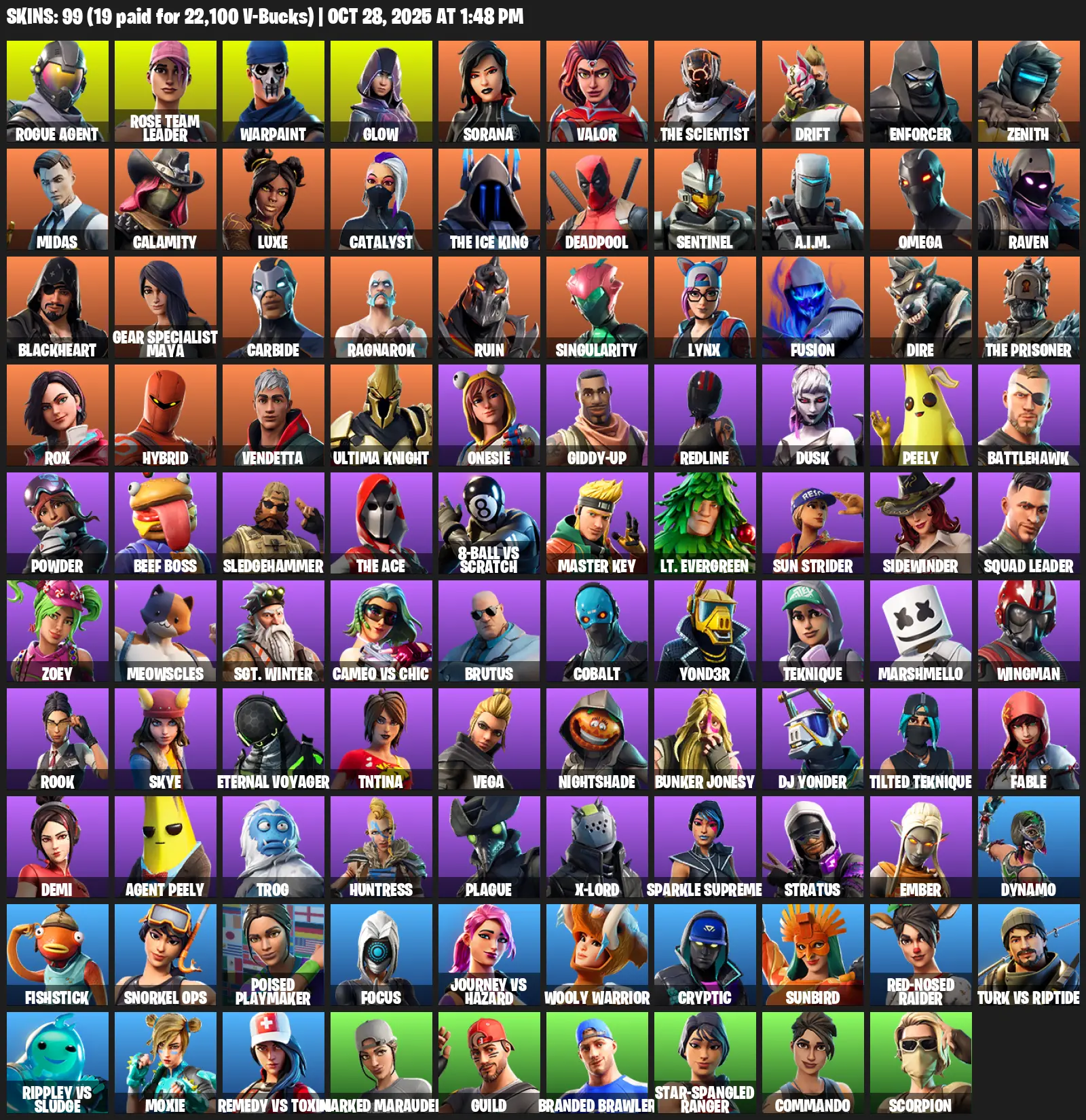 [PC/XBOX] 99 Skins | Rogue Agent | Rose Team Leader | Warpaint | Glow | Sorana | Valor | The Scientist | Drift | Enforcer | Zenith | Midas | Calamity | Luxe | Catalyst | The Ice King | Deadpool | Sentinel | A.I.M. | Omega | Raven | Blackheart