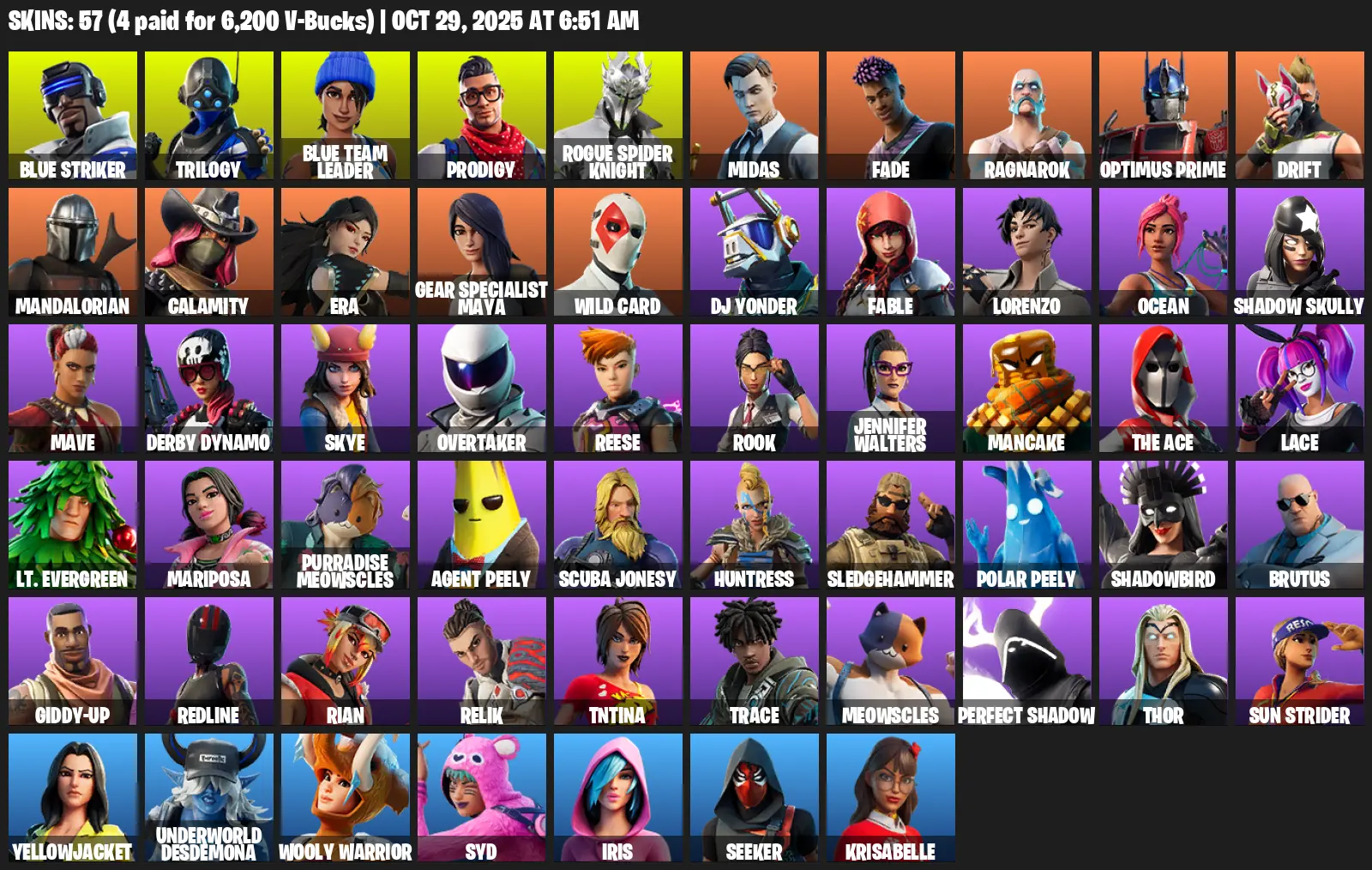 [PC/XBOX/PSN] 57 Skins | Blue Striker | Trilogy | Blue Team Leader | Prodigy | Rogue Spider Knight | Midas | Fade | Ragnarok | Optimus Prime | Drift | Mandalorian | Calamity | Era | Gear Specialist Maya | Wild Card | DJ Yonder | Fable | Lorenzo | Ocean