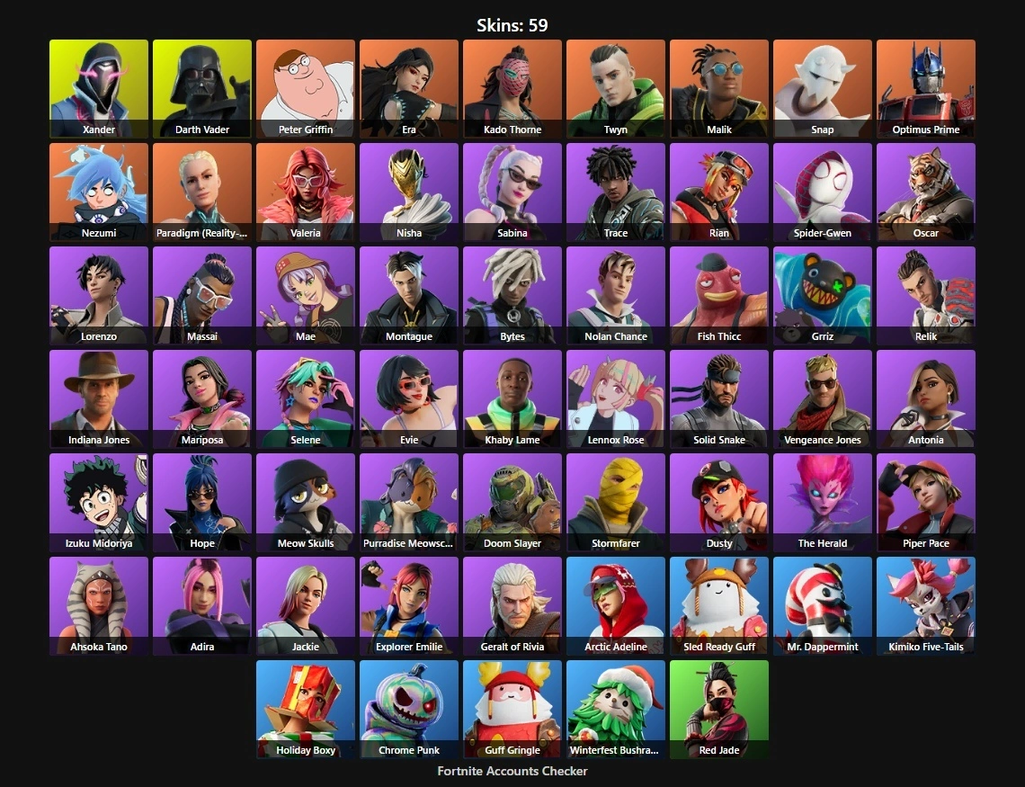 PC/XBOX/PSN 59 Skins⚡ | Darth Vader | Xander | Peter Griffin | Era | Kado Thorne | Twyn | Malik | Snap | Optimus Prime | Nezumi | Paradigm (Reality-659)
