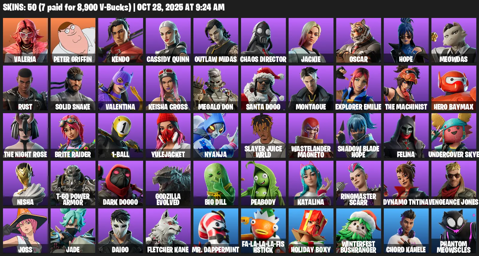 [PSN/XBOX/PC] 50 Skins | Valeria | Peter Griffin | Kendo | Cassidy Quinn | Outlaw Midas | Chaos Director | Jackie | Oscar | Hope | Meowdas | Rust | Solid Snake | Valentina | Keisha Cross | Megalo Don | Santa Dogg | Montague | Explorer Emilie