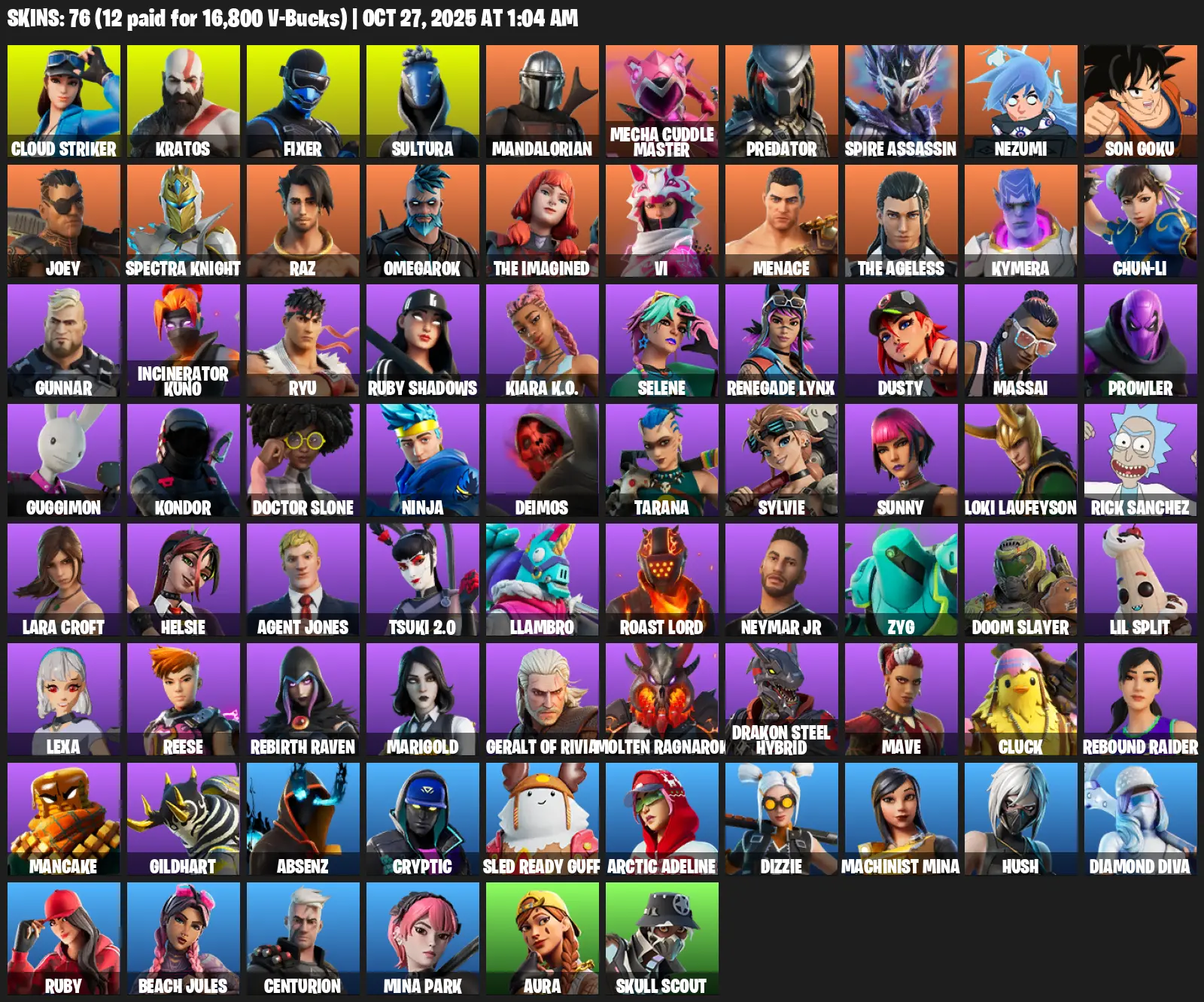 [PSN/XBOX/PC] 76 Skins | Cloud Striker | Kratos | Fixer | Sultura | Mandalorian | Mecha Cuddle Master | Predator | Spire Assassin | Nezumi | Son Goku | Joey | Spectra Knight | Raz | Omegarok | The Imagined | Vi | Menace | The Ageless | Kymera | Chun-Li