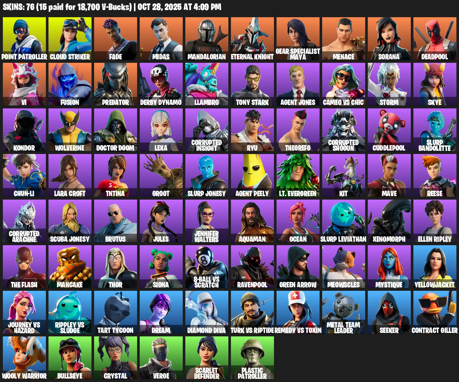 [PSN/XBOX/PC] 76 Skins | Point Patroller | Cloud Striker | Fade | Midas | Mandalorian | Eternal Knight | Gear Specialist Maya | Menace | Sorana | Deadpool | Vi | Fusion | Predator | Derby Dynamo | Llambro | Tony Stark | Agent Jones | Cameo vs Chic | Storm
