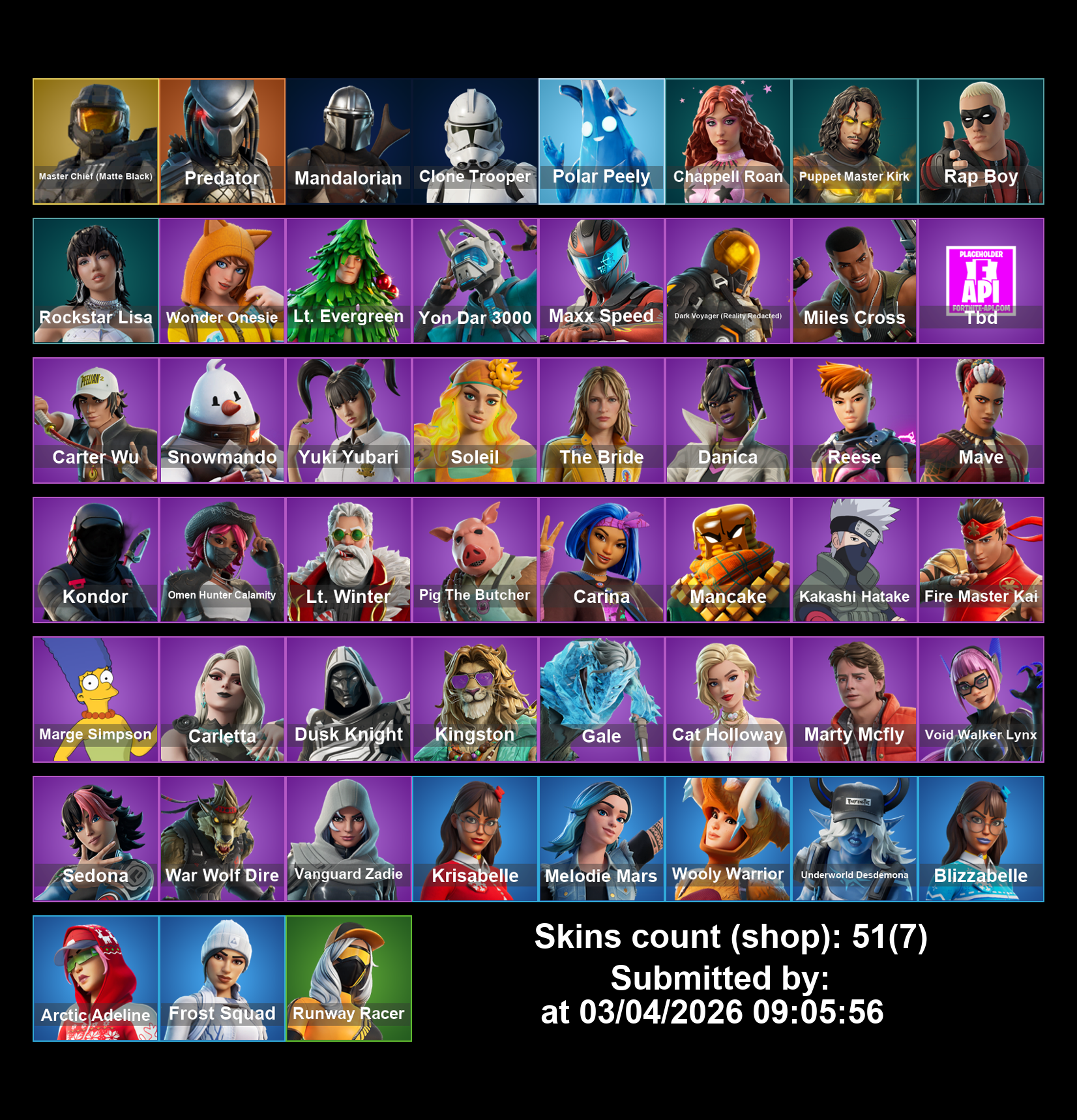 #SM4482 [PC/PSN/XBOX] 51 skins | Master Chief (Matte Black) | Predator | Mandalorian | Clone Trooper | Polar Peely | Chappell Roan | Puppet Master Kirk | Rap Boy | Rockstar LISA