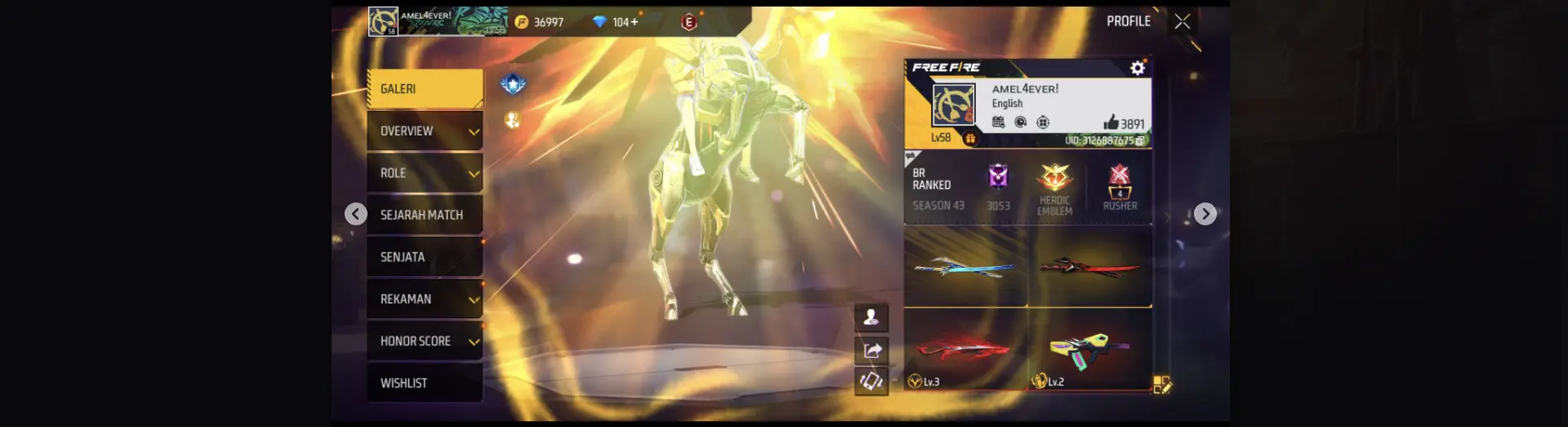 FF109|Lv58/204Weapon(10EvoGun+40Mythic)/AK47 BLUE FLAME DRACO LV MAX/219Costume(13 Mythic)/18Title(3Mythic)/45Emote(1Artifact+16Mythic)/43Backpack/48Vehicle, look at the pictures given in the description.