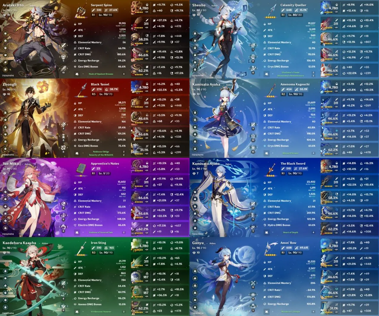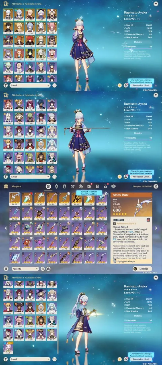 All Platform 🎮 EU 🇪🇺 AR58 🎯 55 Character 21 5'Star 🏆 7 Weapon 5'Star 🛍️ Ayaka 🔫 Ayato 🎯 Itto 🌹 Yae Miko ⚔️ Zhongli 🌟 Code1278
