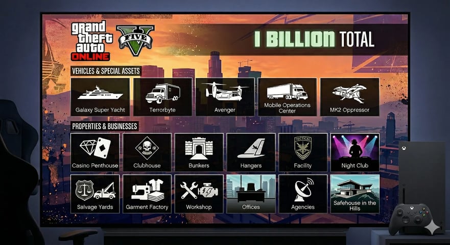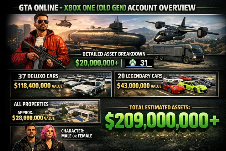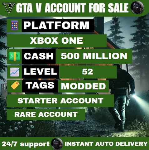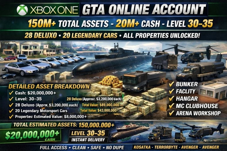 Ang mga Xbox One account ay kasama ang lahat ng pag-aari sa laro at pag-unlad ng karakter nang hindi nangangailangan ng karagdagang pagbili. Ang mga cash balance ay mula daan-daang milyon hanggang bilyon, depende sa package, na sumasaklaw sa lahat mula sa mga negosyo at ari-arian hanggang sa mga fully upgraded na sasakyan at armas.