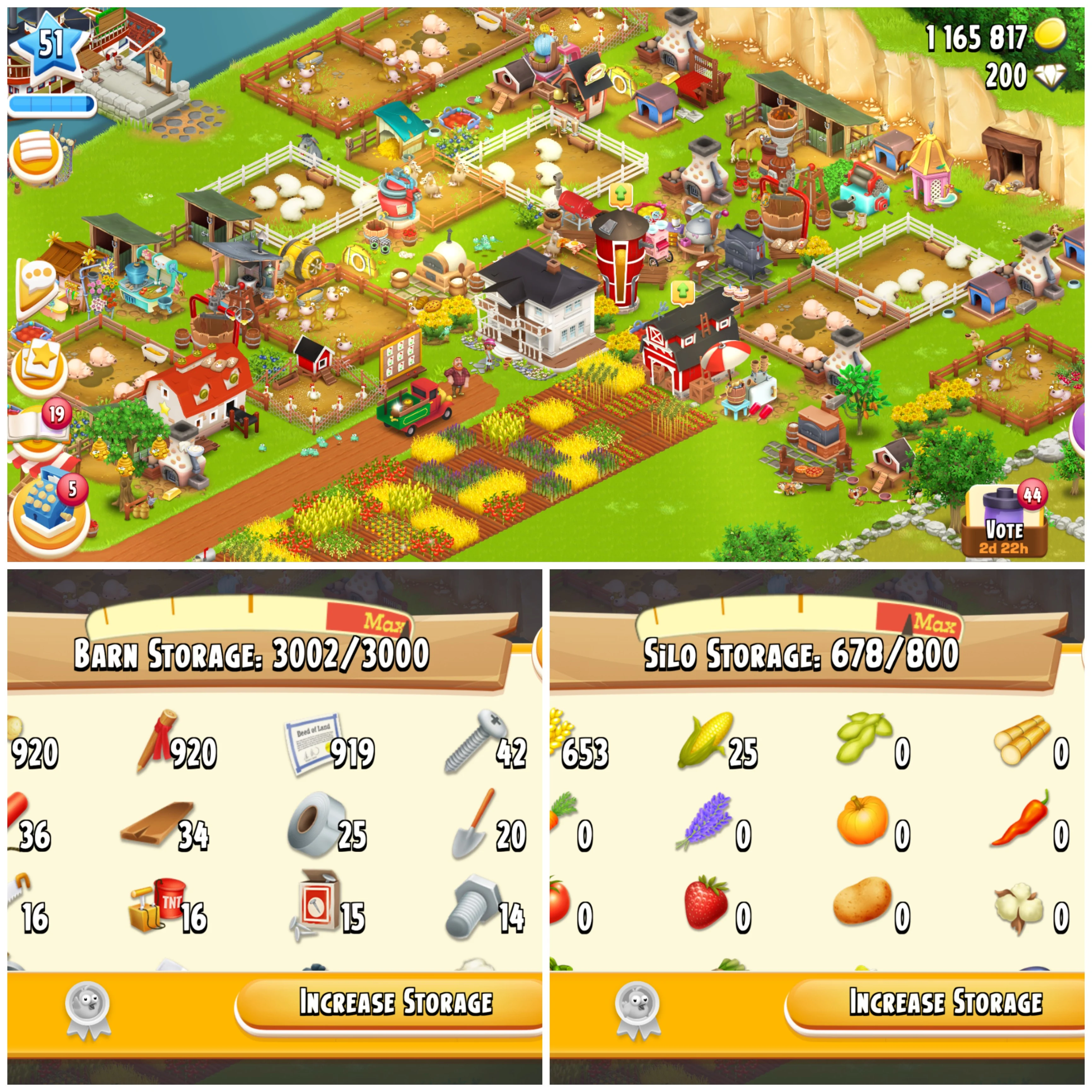 LEVEL 51 ⚔️ 3000 BARN ⚔️ 800 SILO ⚔️ FULLY FILLED LAND TOOLS ⚔️ 1.1M COINS ⚔️ 200 DIAMONDS ⚔️ FULLY STACKED ⚔️ FULL ACCESS ⚔️ Instant Delivery