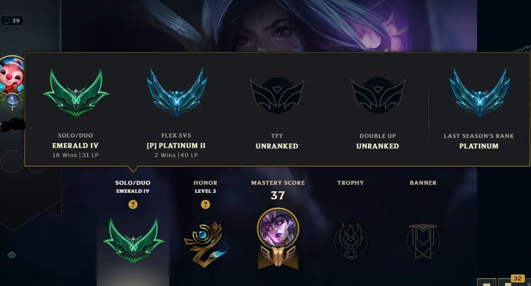 🚀【EUW】✨ Emerald IV ⚡ Champs: 33 ⸱ Skins: 6 🌊 BE: 18401 ⚡ 50% WR