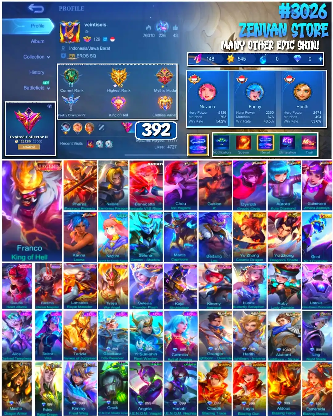 #3026 ๐ฅ 392 Skins ๐ฅ Legend Franco ๐ฅ Collector Pharsa & Natalia ๐ฅ Ducati Benedetta ๐ฅ Clouds Kagura ๐ฅ Prime Yu Zhong ๐ฅ KoF Chou, Gusion, Dyroth, Karina, Guinevere, Aurora ๐ฅ Many Limited ๐ฅ Many Epic ๐ฅ Safe Account โ