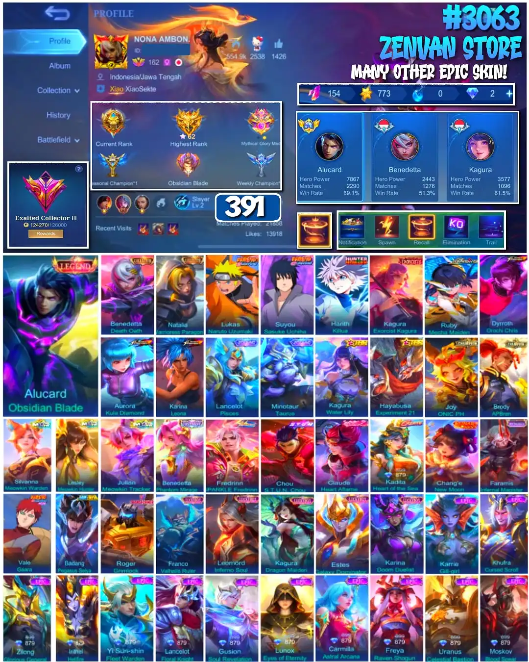 #3063 ๐ฅ 391 Skins ๐ฅ Legend Alucard ๐ฅ Collector Benedetta, Natalia ๐ฅ Naruto, Sasuke, Killua ๐ฅ Exorcist Kagura ๐ฅ Aspirant Ruby ๐ฅ KoF Karina, Aurora ๐ฅ Many Limited ๐ฅ Many Epic ๐ฅ Safe Account โ