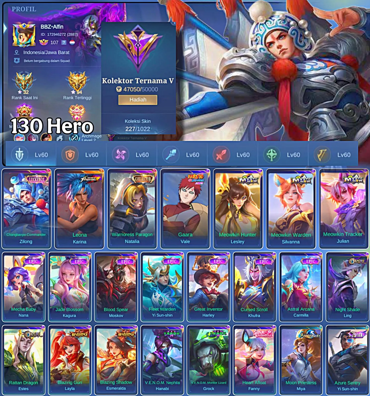 HERO 130 SKIN 227 | EMBLEM ALL MAX | COLECTOR NATALIA | LUCKBOX ZILONG | KOF KARINA| VALE GARA | HERO GOOD | SKIN GOOD | INSTAN DELIVERY