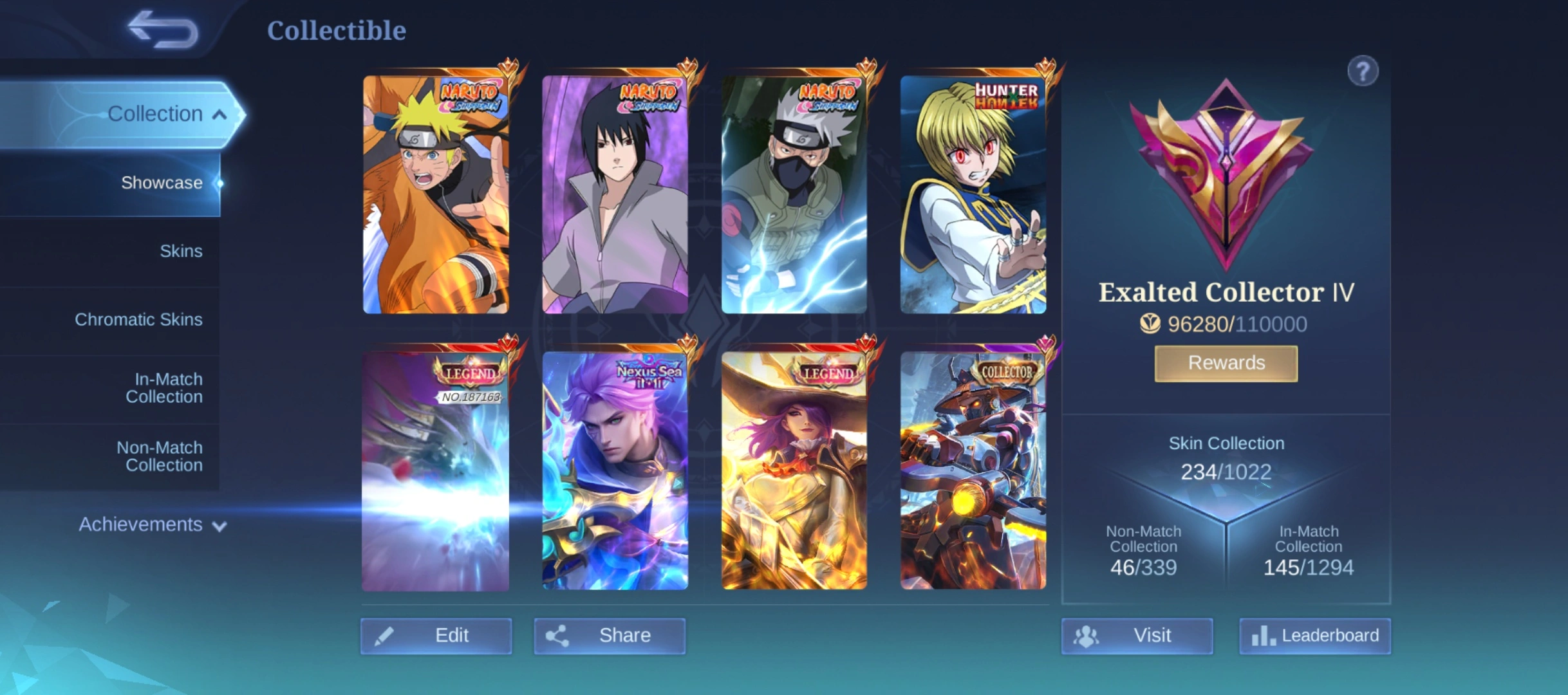 N283|LV 43|EXALTED COLLECTOR IV|234 SKIN|2 LEGEND(ALPHA,LESLEY)3 NARUTO(HAYA,SUYOU,LUKAS)NOLAN NEXUS|JULIAN KURAPIKA|2 PRIME|2 KOF|3 COLLECTOR