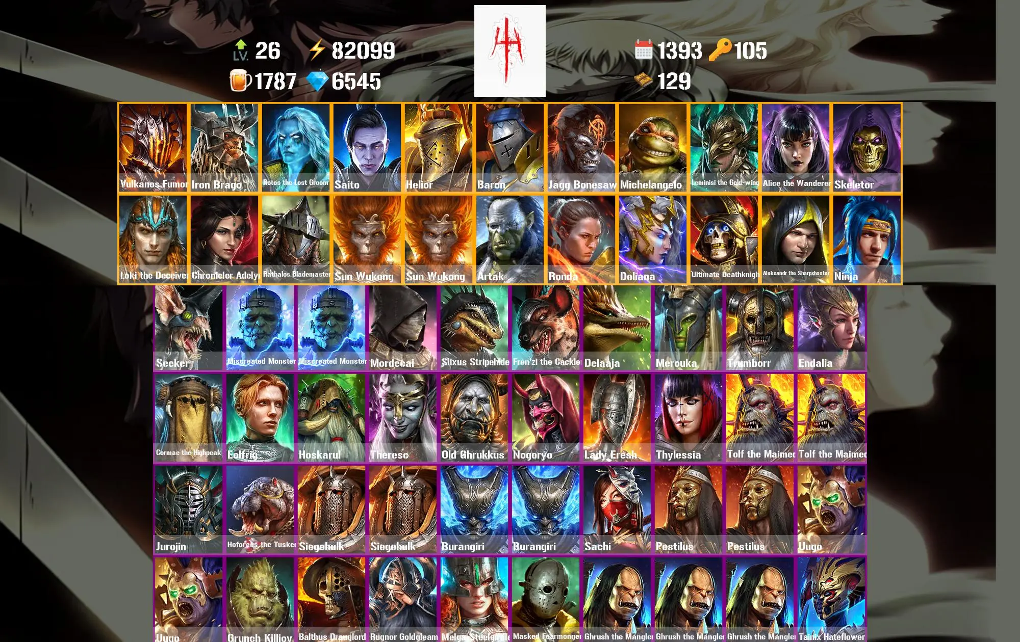 1393 Days 82.1k Energy Vulkanos Fumor ⸱ Iron Brago ⸱ Rotos the Lost Groom ⸱ Saito ⸱ Helior ⸱ Seeker ⸱ Miscreated Monster ⸱ 51.9m Silver ⸱ 6.5k Gems
