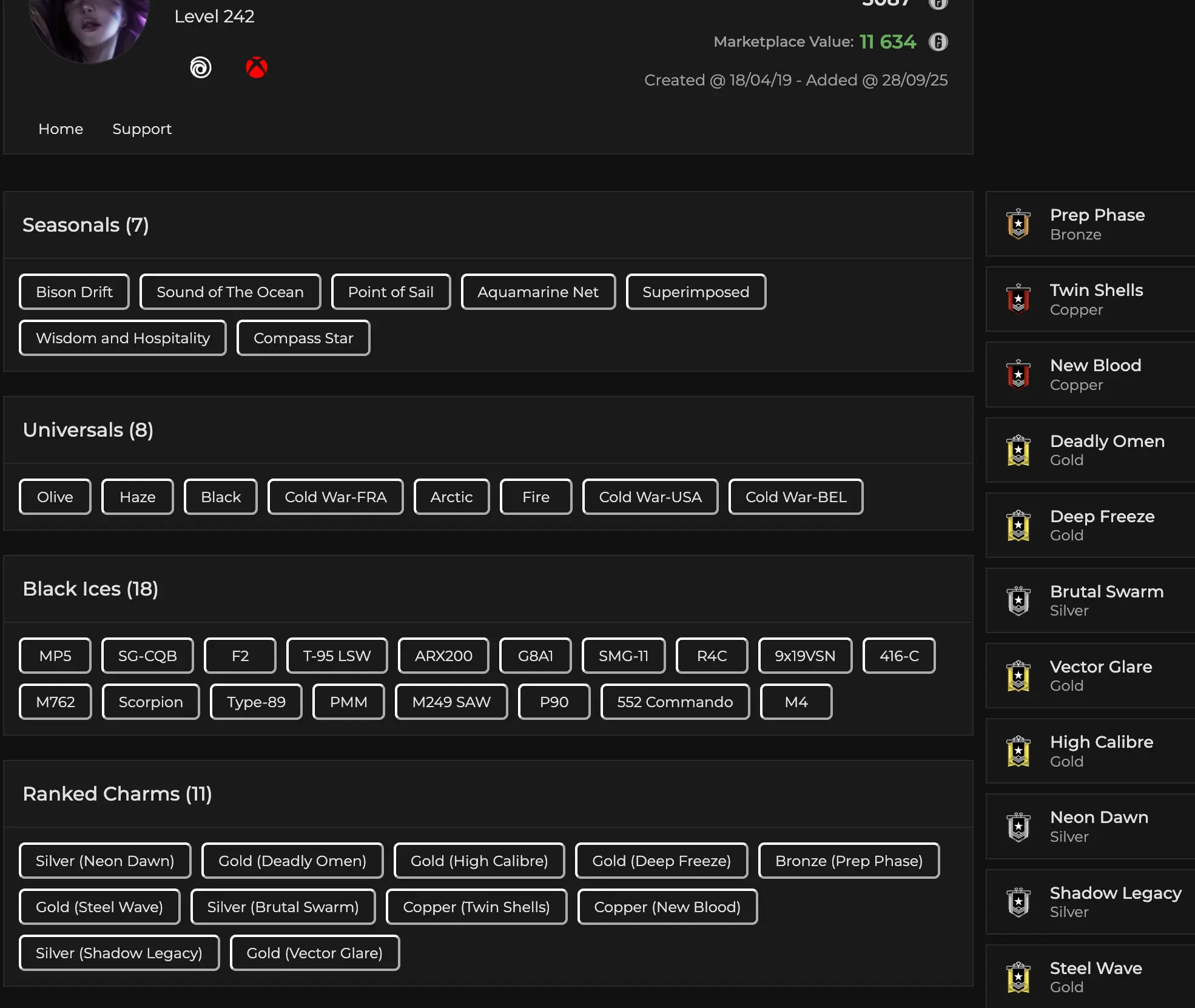 🔰 [PC/PSN] Ranked Ready | Level 242 | Fire | 18x Black ice | 7x Seasonal | 8x Universal | 5x Gold | 3x Elites | 11x Legendary Skins | Pro League | 69 Operators | 3087 R6 Credits | 59,245 Renown 💰