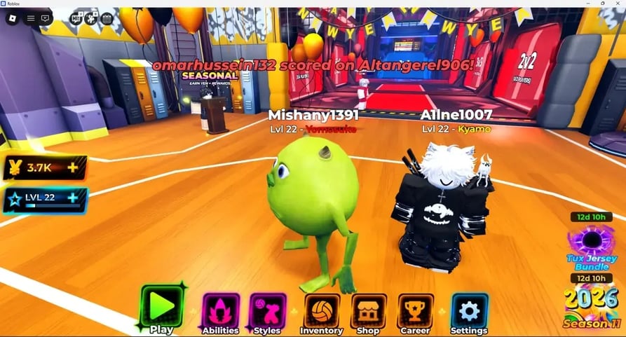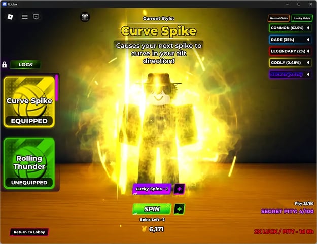 Ang laro ay may sistemang progresyon na nakasentro sa Styles at Abilities. Ang Styles ang tumutukoy sa stats ng iyong karakter sa iba't ibang volleyball skills gaya ng taas ng talon, lakas ng spike, bisa ng block, at lakas ng serve. May limang rarity tiers ito: Common, Rare, Legendary, Godly, at Secret, kung saan ang mas mataas na rarity ay nag-aalok ng mas magandang pangkalahatang performance. Ang Abilities naman ay mga active skills na maaari mong i-activate habang naglalaro upang magkaroon ng tactical advantages. Parehong Styles at Abilities ay nakakamit sa pamamagitan ng spin system kung saan gumagastos ang mga manlalaro ng in-game currency (Yen) o Lucky Spins para sa mga random na reward. Ang mga codes ay nagbibigay ng dagdag na spins para makatulong na ma-unlock ang mas magagandang options.