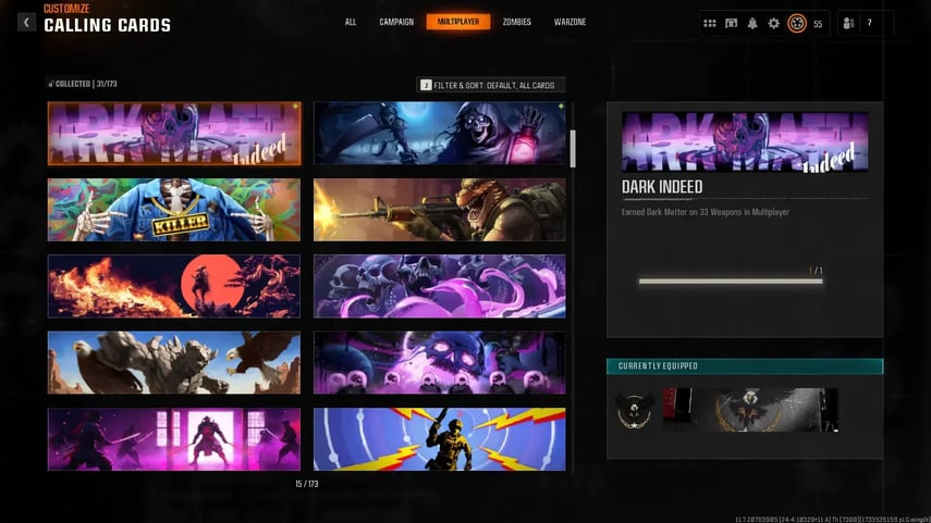 Dark matter 33 ⚡ Level 55 ⚡ 50 Wins ⚡ 495 Camos⚡ All Multiplayer Camos Are Unlocked on 33 Weapon💎 Level 55 🕸️ Dark Spine 33 ⚡ Diamond 33 ⚡ Gold Camos 33 💎 Linkable to: Steam, Battle.net, PSN, Xbox 🌐 Black Ops 6