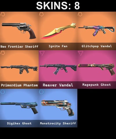 8 SKINS | 1 KNIFE | IGNITE FAN | NEO FRONTIER SHERIFF | PRIMORDIUM PHANTOM | GLITCHPOP VANDAL | MAGEPUNK GHOST | REAVER VANDAL | DIGIHEX GHOST | MONSTROCITY SHERIFF | NA | BRONZE 3 | 21 AGENTS | FULL ACCESS | SCREENSHOTS INSIDE