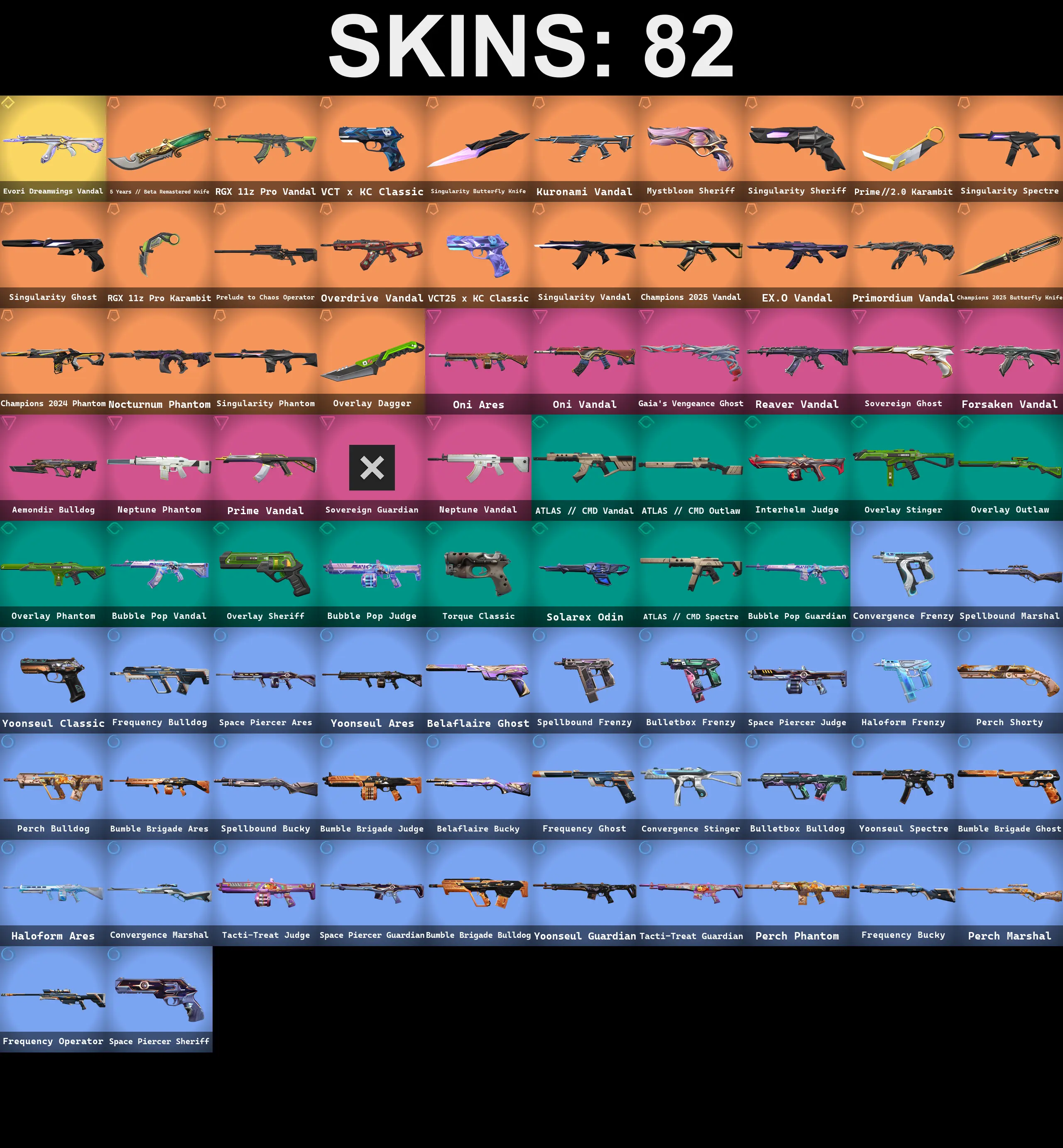 ❤️ 82 SKINS ❤️ 6 KNIFE ❤️ CHAMPIONS 2024 PHANTOM ❤️ 5 YEARS // BETA REMASTERED KNIFE ❤️ KURONAMI VANDAL ❤️ VCT X KC CLASSIC ❤️ VCT25 X KC CLASSIC ❤️ RGX 11Z PRO KARAMBIT ❤️ RGX 11Z PRO VANDAL ❤️ NOCTURNUM PHANTOM