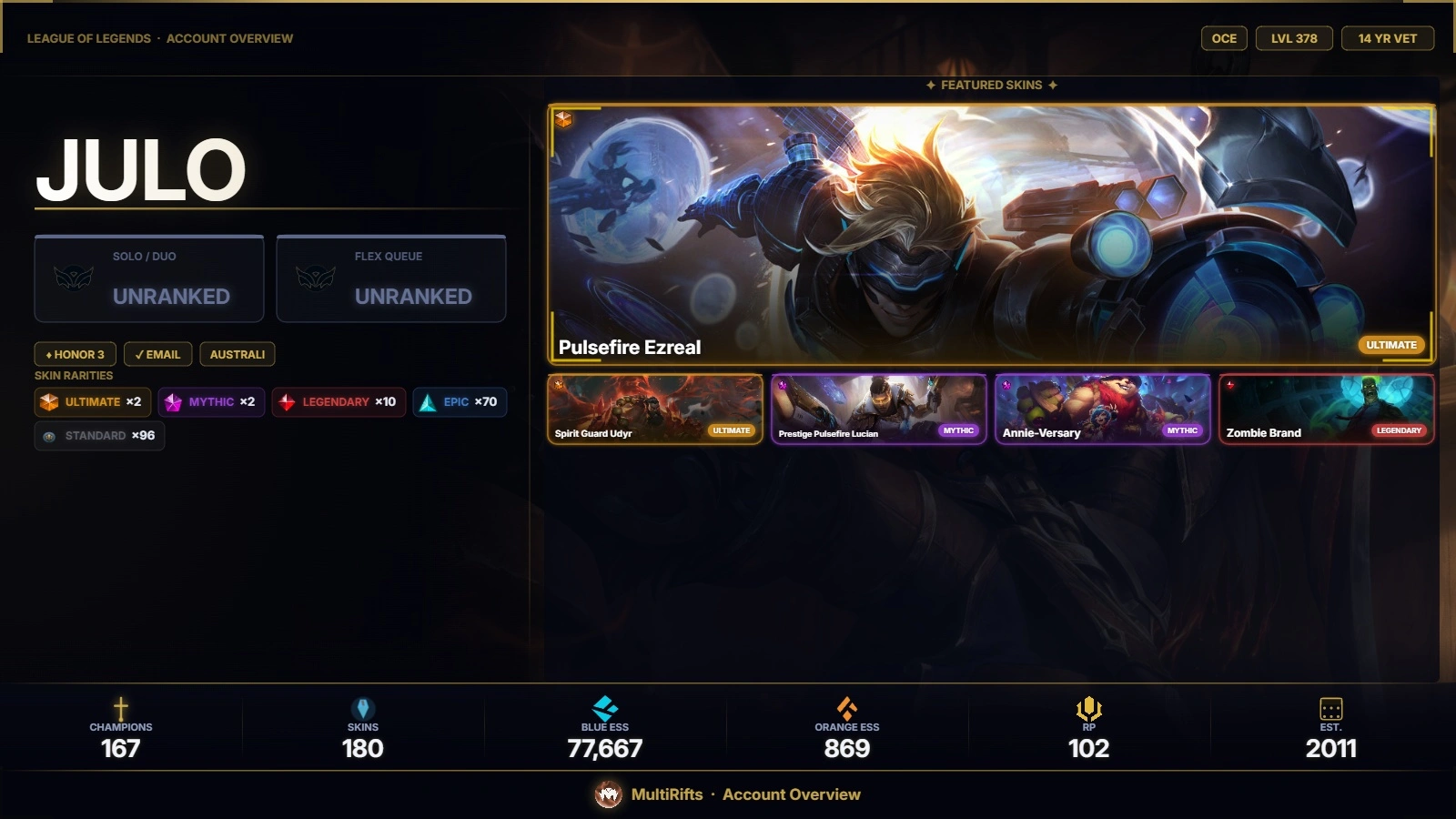 🔫 【AP】 ⸱ 🌟 LVL 226 ⸱ 🎖️ Unranked | 🖌️ 118 Skins ⸱ [ 💸 353 VP , 105 RD ] ⸱ 🔥 Protocol 781-a Bundle (4) ⸱ 😈 Ready2Smurf ⚡ 🎮 +LoL Lv378 180Skins