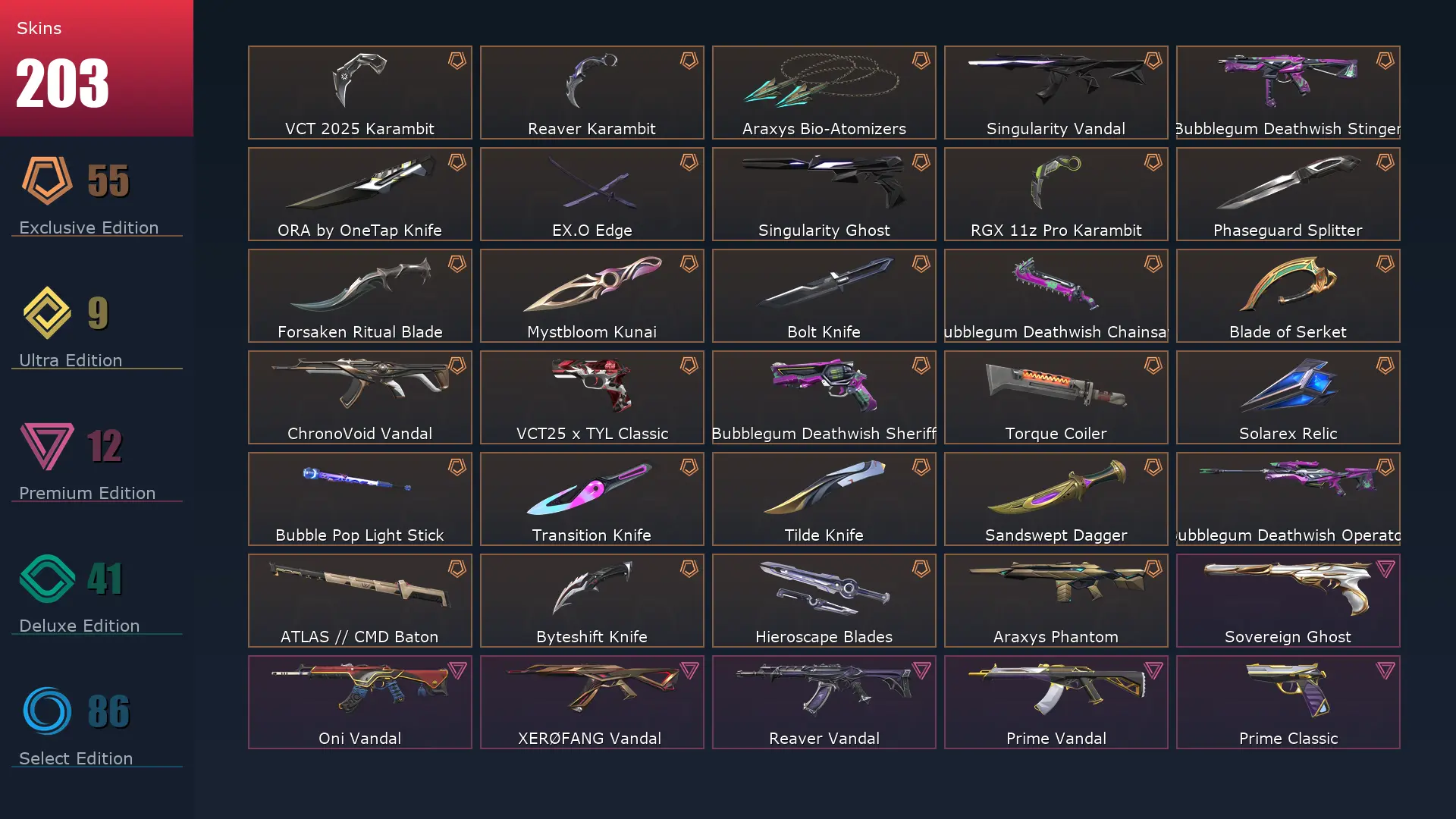 Platinum 1 ๐คค 28 Agents ๐ 192 Level ๐น Arcane Vandal ๐ Champions 2025 Vandal ๐คฒ Champions 2024 Phantom ๐ Champions 2025 Butterfly Knife ๐ Champions 2024 Blade ๐คพโโ๏ธ EX.O Edge ๐บ Bubblegum Deathwish Chainsaw