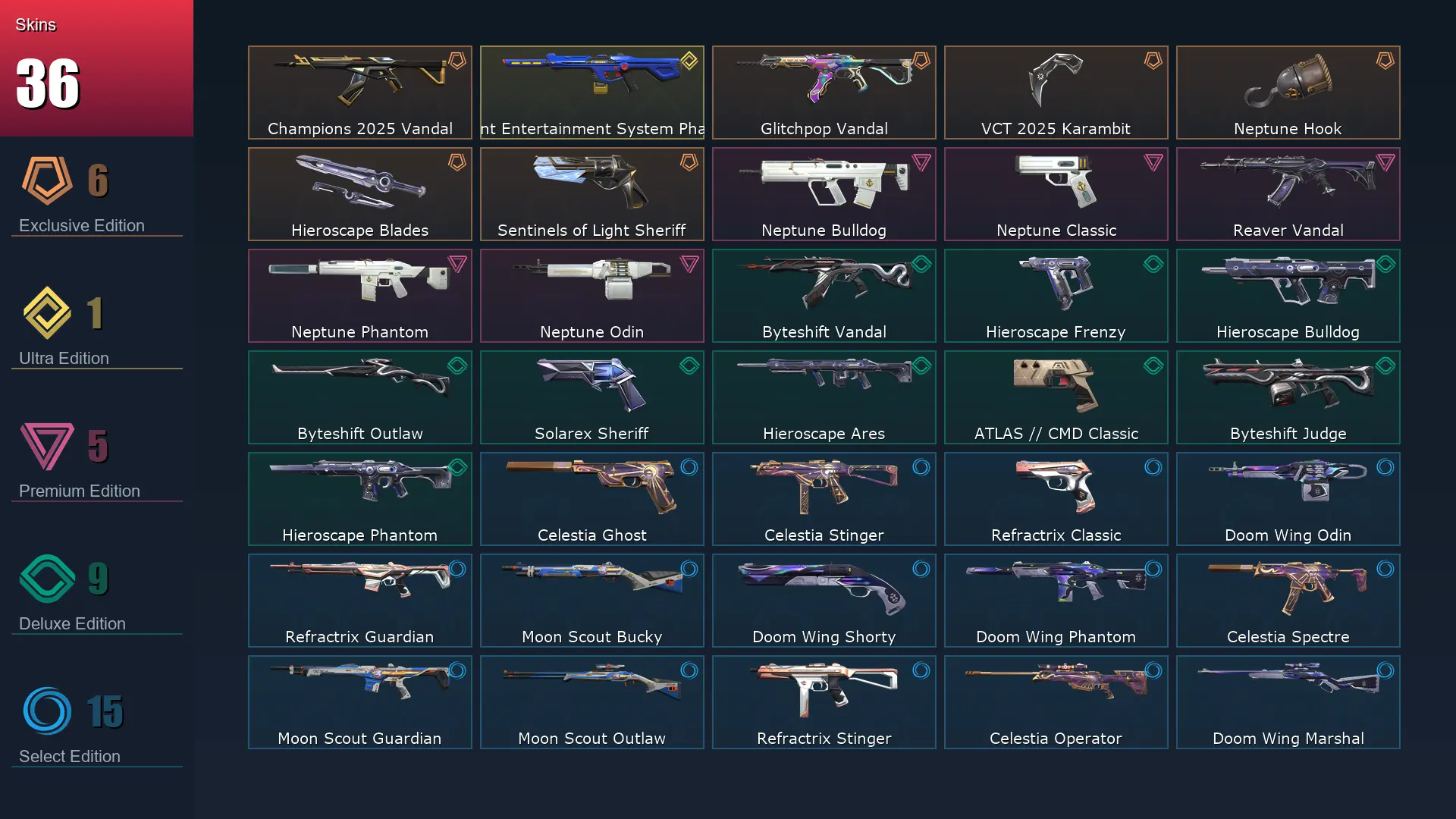 🌊 EU 🫦 Level 96 🎄 36 Skins 🛌 28 Agents 🐥 Champions 2025 Vandal 👛 Glitchpop Vandal 🪒 VCT 2025 Karambit 🎤 Neptune Bulldog 🍫 Neptune Bulldog 👝 Neptune Odin 🍍 Sentinels of Light Sheriff 👑 Sentinels of Light Sheriff 🧥 Glitchpop Vandal