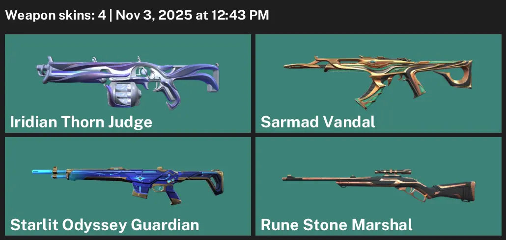 😵💫 EU 🚕 Unranked 🌁 4 Skins 🐇 235 VP ☕️ 1 Agents 🚤 Value: 1275 VP 🦨 Iridian Thorn Judge 🏋️ Sarmad Vandal 🖇 Starlit Odyssey Guardian 🖼 Rune Stone Marshal