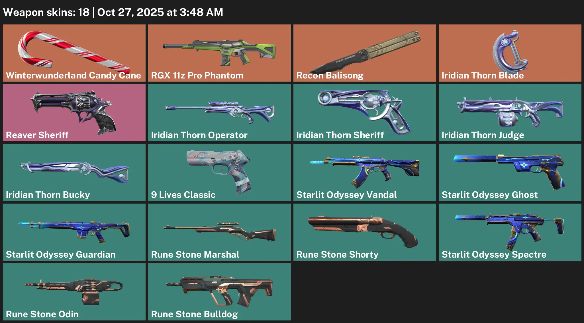 LA | 18 Skins | exp BRONZE 2 | Recon Balisong | Winterwunderland Candy Cane | RGX 11z Pro Phantom | Reaver Sheriff | Starlit Odyssey Vandal | S4G