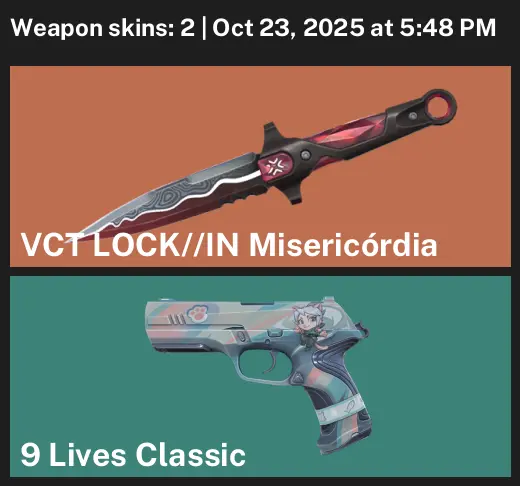 💽 LA 👢 Unranked 🍢 2 Skins 🍌 105 VP 🤏 11 Agents 🏒 Value: 5440 VP 👐 VCT LOCK//IN Misericórdia 🦠 9 Lives Classic
