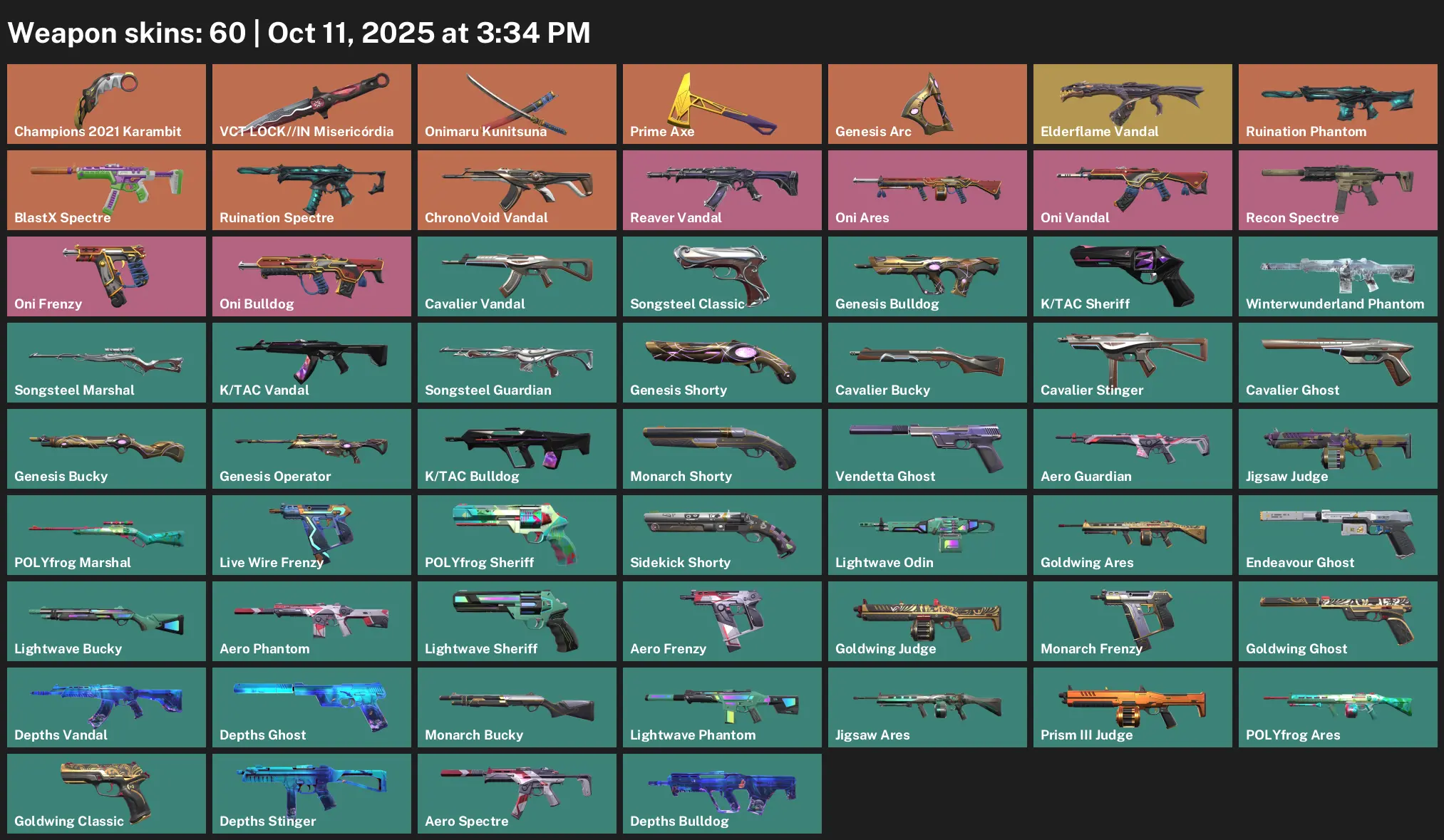 🥗 LA 🪴 Unranked 🤸♂️ 60 Skins 🍜 277 VP 💫 19 Agents 🎀 Value: 43665 VP 😵💫 Champions 2021 Karambit 🥖 VCT LOCK//IN Misericórdia 🖕 Onimaru Kunitsuna 🥟 Prime Axe 🐲 Genesis Arc 🌖 Elderflame Vandal