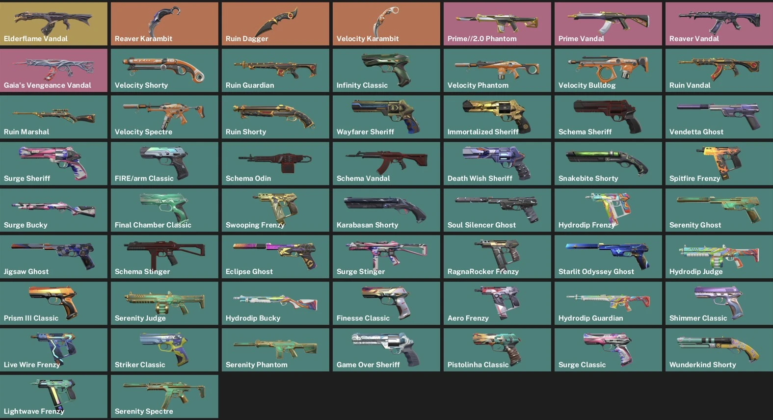 NA ⸱ LVL 287 ⸱ UNRANKED ⸱ 3 KNIVES ⸱ 58 SKINS (~13,925 VP) Elderflame Vandal, Reaver Karambit, Ruin Dagger, Velocity Karambit, Prime2 Phantom
