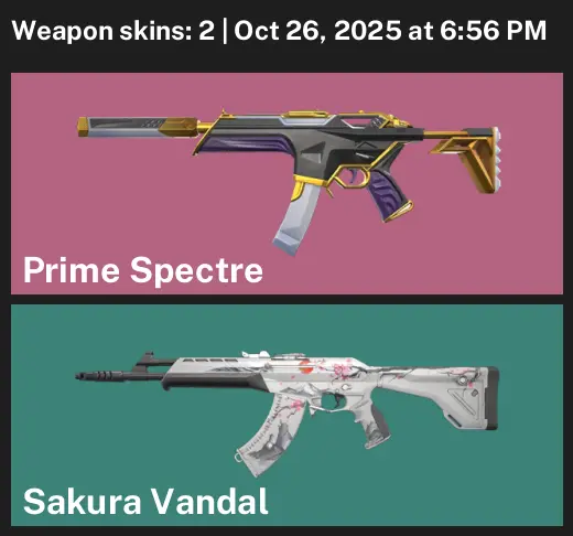 đĨ NA đĸ Unranked đļ 2 Skins đ 67 VP đĻ 3 Agents đ Value: 3050 VP đģ Prime Spectre đ Sakura Vandal