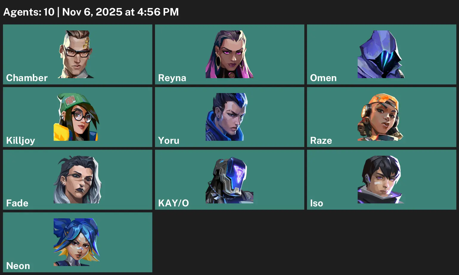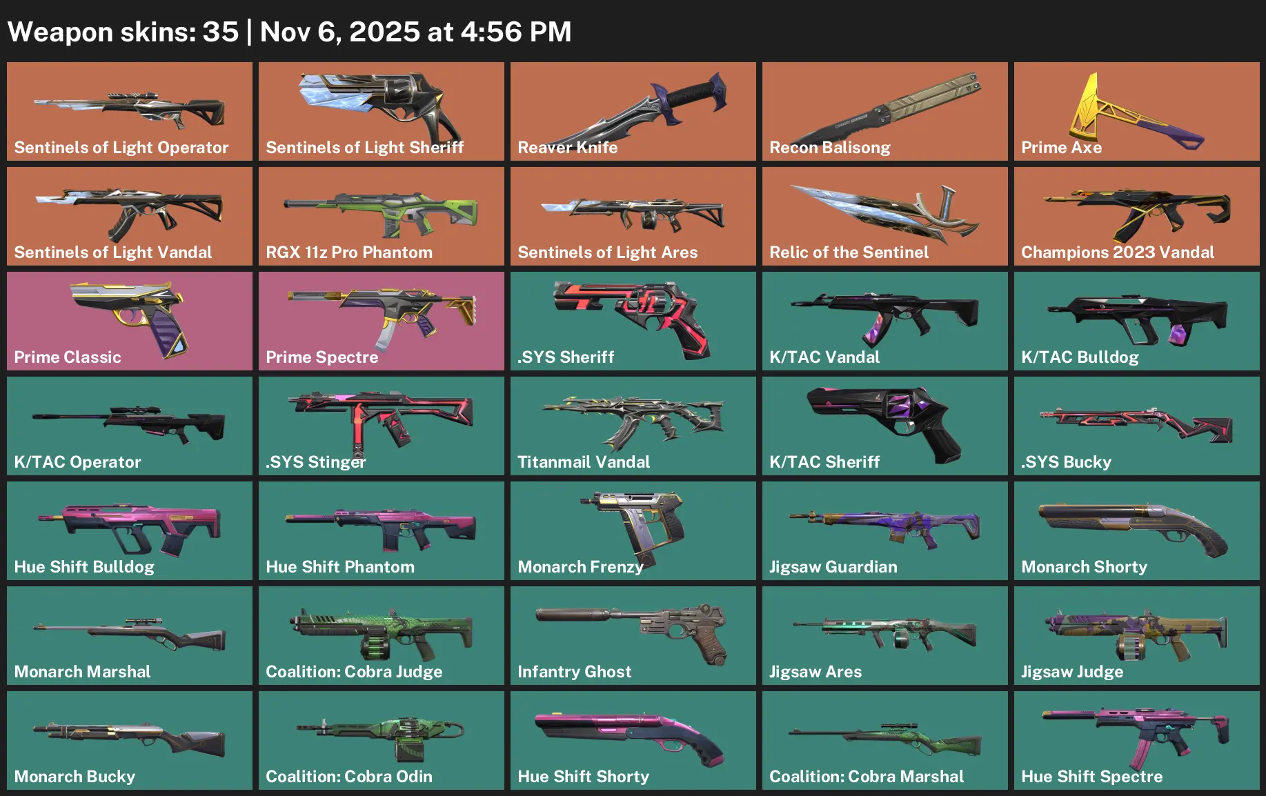 🪟 NA 🤾 Unranked 🦡 35 Skins 🤲 240 VP ⛩ 10 Agents 🌲 Value: 34250 VP 🗑 Sentinels of Light Operator 🪃 Sentinels of Light Sheriff 🥏 Reaver Knife 🏩 Recon Balisong 🍮 Prime Axe 🚈 Sentinels of Light Vandal