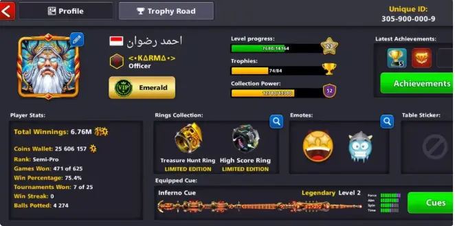 IK568 // Endgame Account with 10 Legendary Cues: Archa, Atlantis, Plasma, Thor Hammer, Medusa, Kraken, Inferno, Laser, Phoenix, Mythical