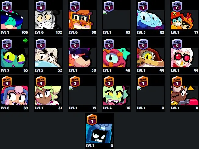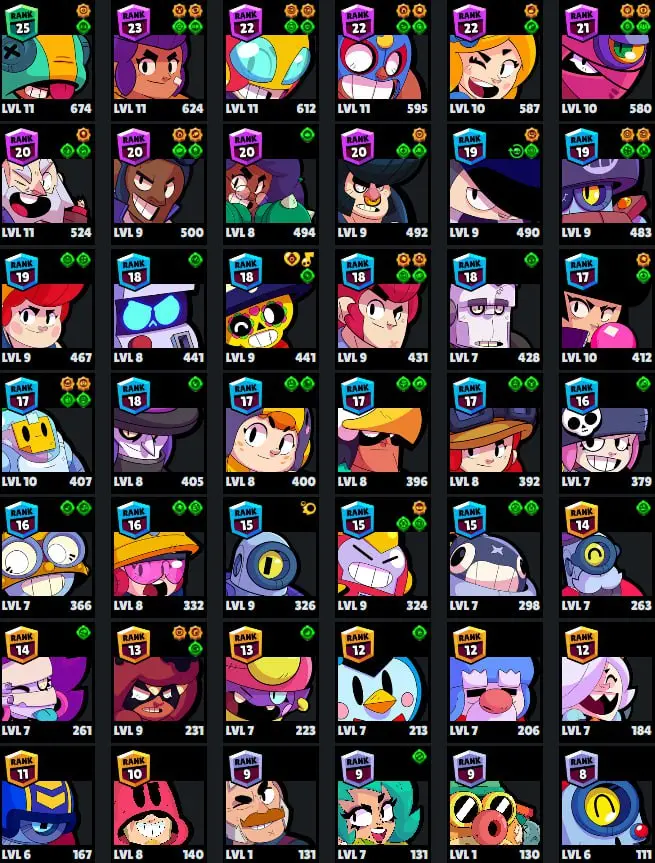 👑 61 Brawlers 👑 16.647 Trophies 👑 55 Skins 👑 2 Legends 👑 15 Mythics 👑 25 Epics 👑 1796 Gold 👑 44 Gems 👑 1306 Blings 👑