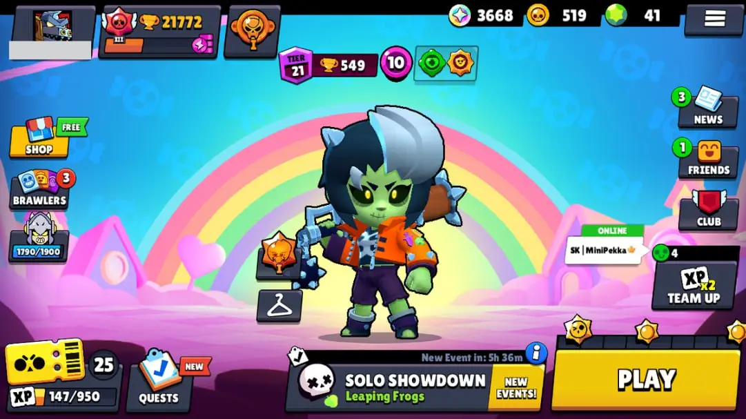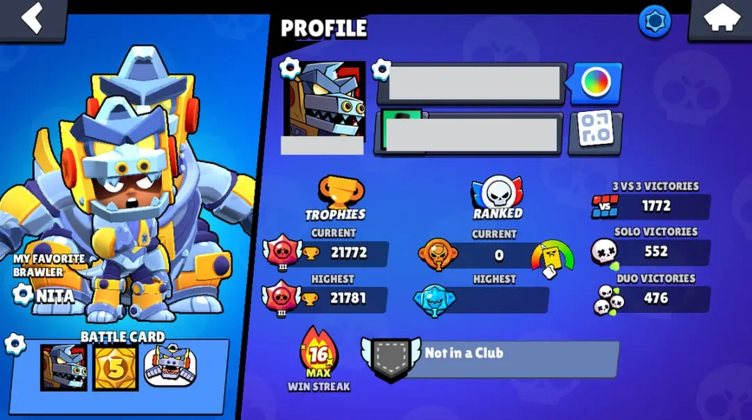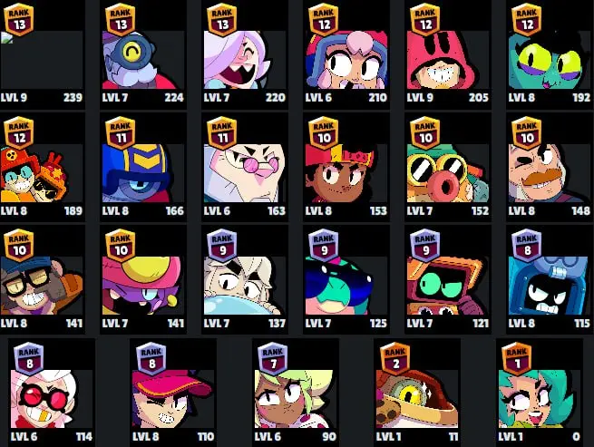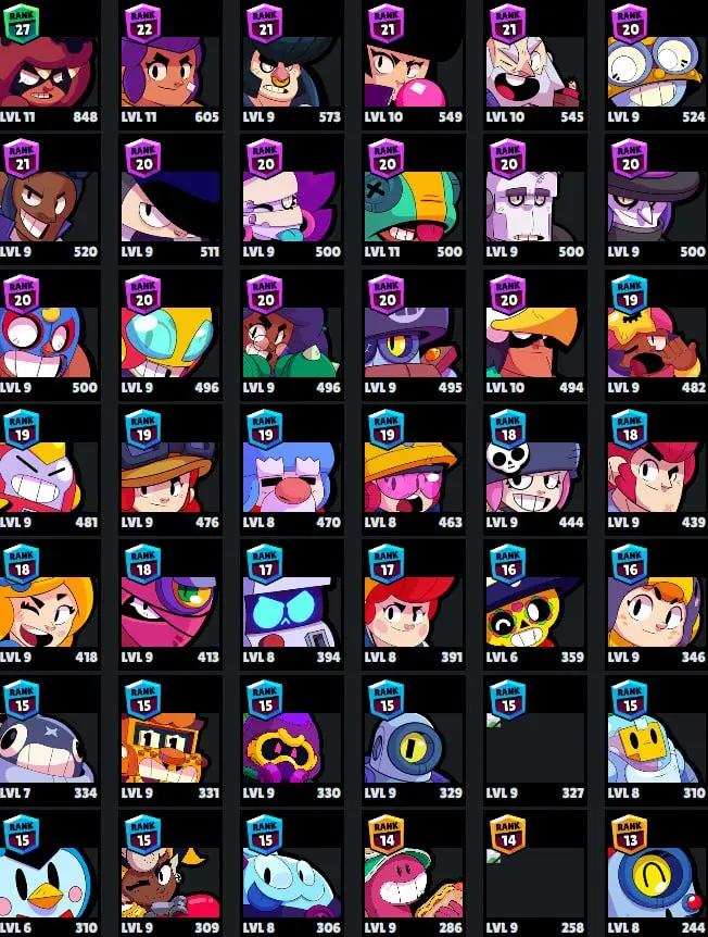 👑 65 Brawlers 👑 21.772 Trophies 👑 52 Skins 👑 5 Legends 👑 16 Mythics 👑 25 Epics 👑 519 Gold 👑 41 Gems 👑 3668 Blings 👑