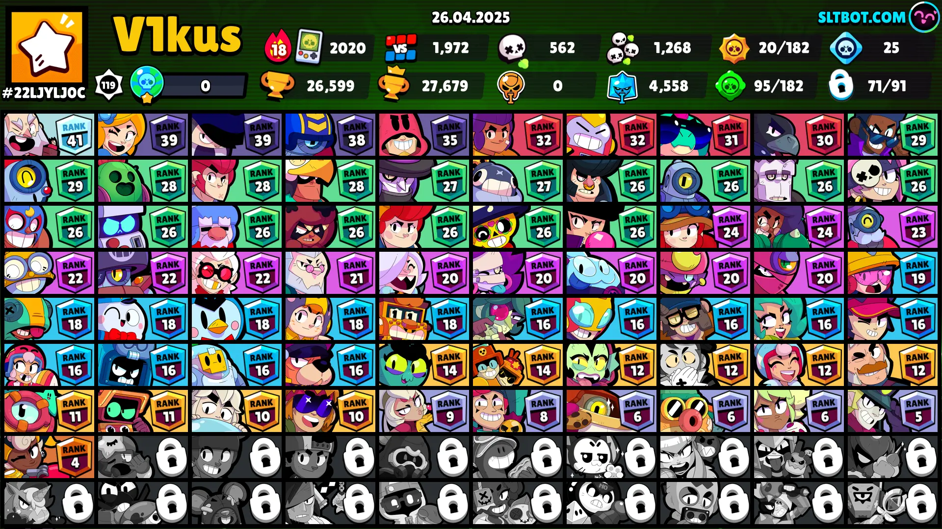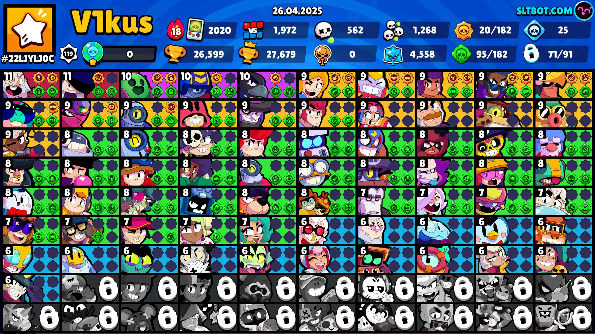 76 SKINS 🩵 26.599 TROPHIES 🏆 71 BRAWLERS 🧸 1 HYPERCHARGED 🩸 2 MAX BRAWLERS 🩷 PRINCESS SHELLY 🩵 NINJA ASH 🩵 OROCHI EDGAR 🩵 ROBO SPIKE 🩵 ULTRA DRILLER KACKY 🩵 CLASSIC SHELLY 🎀