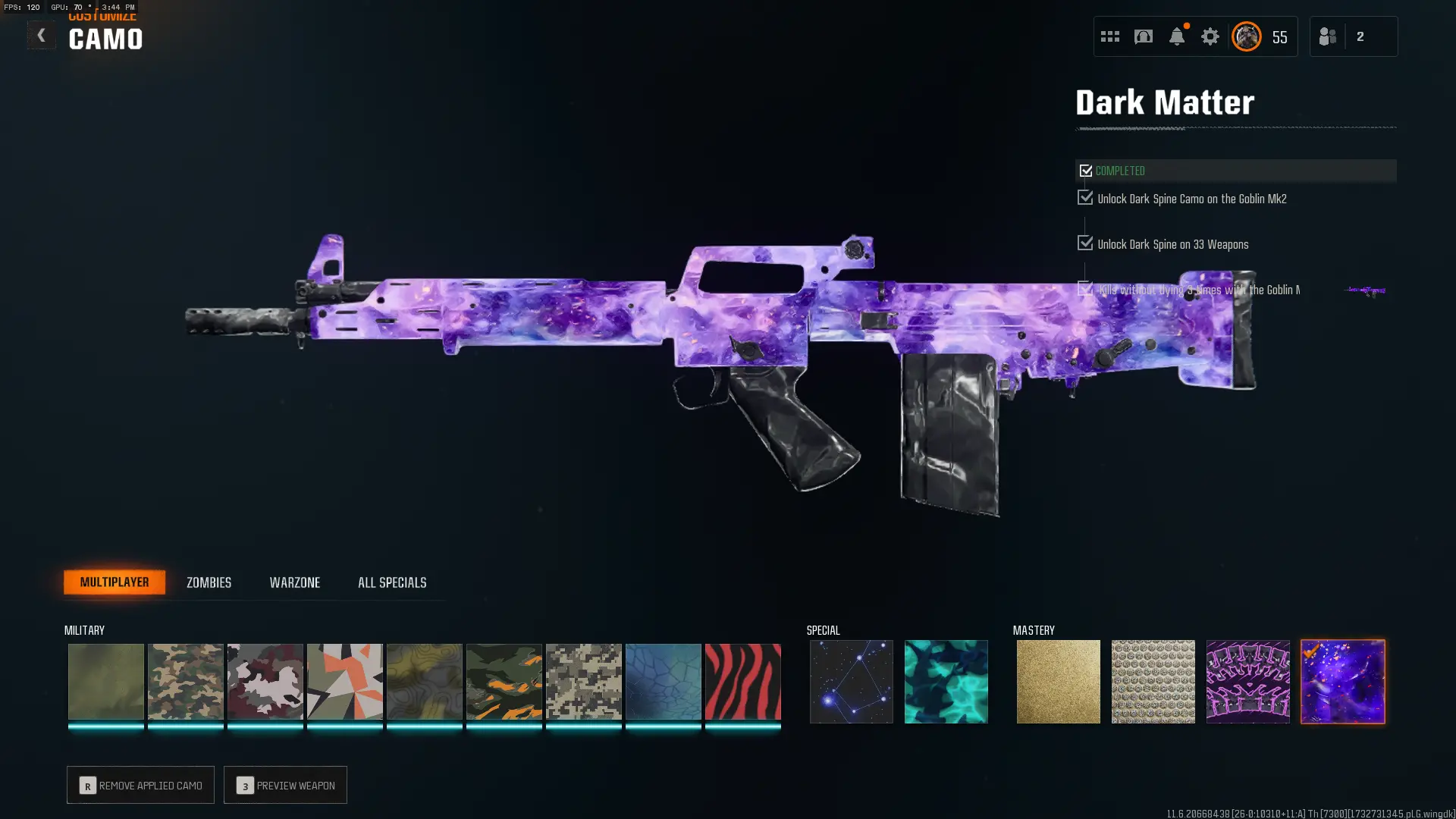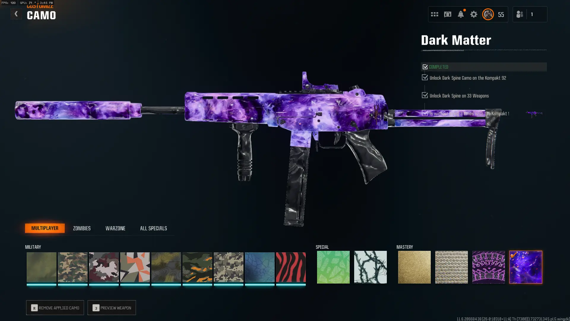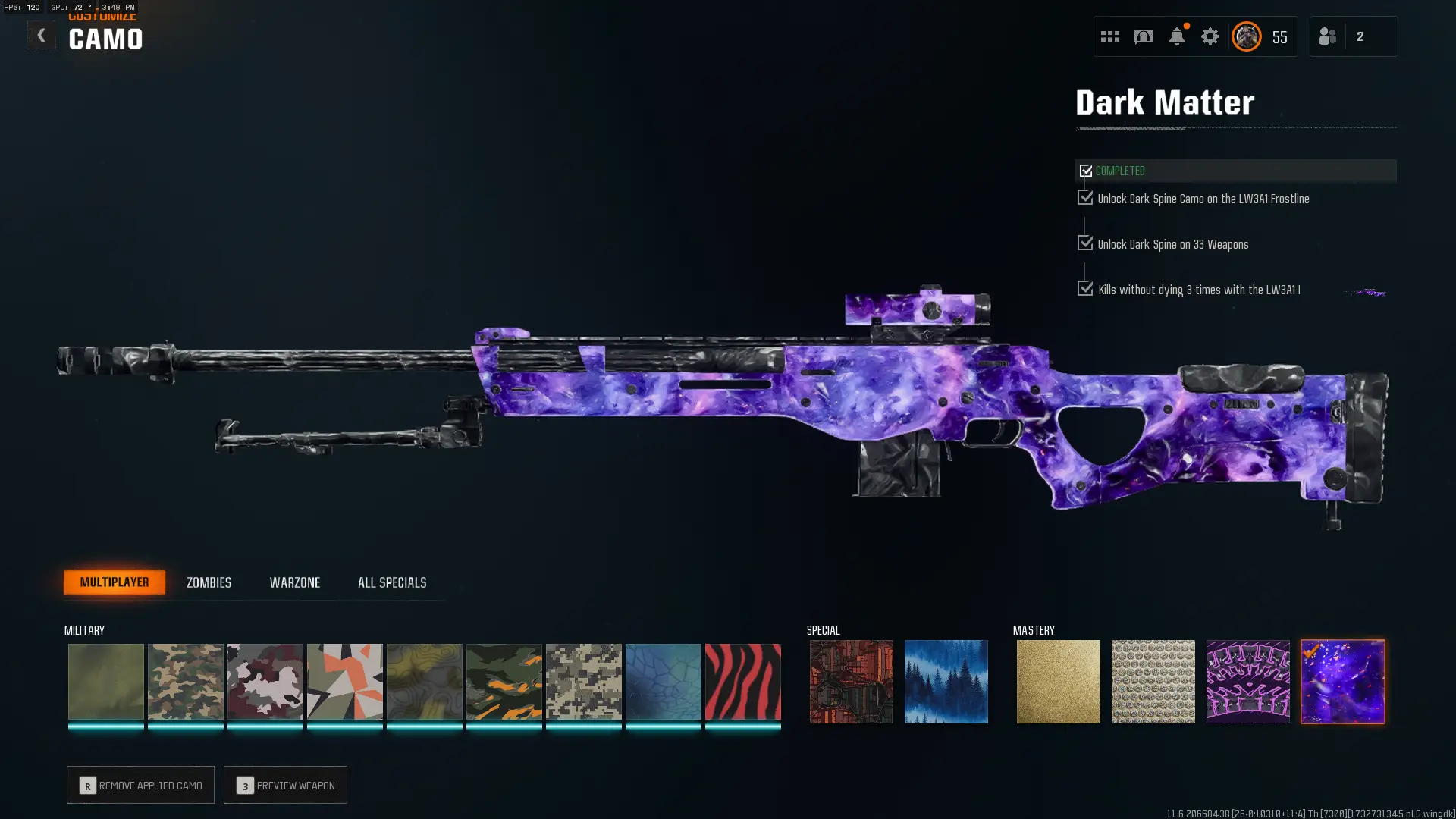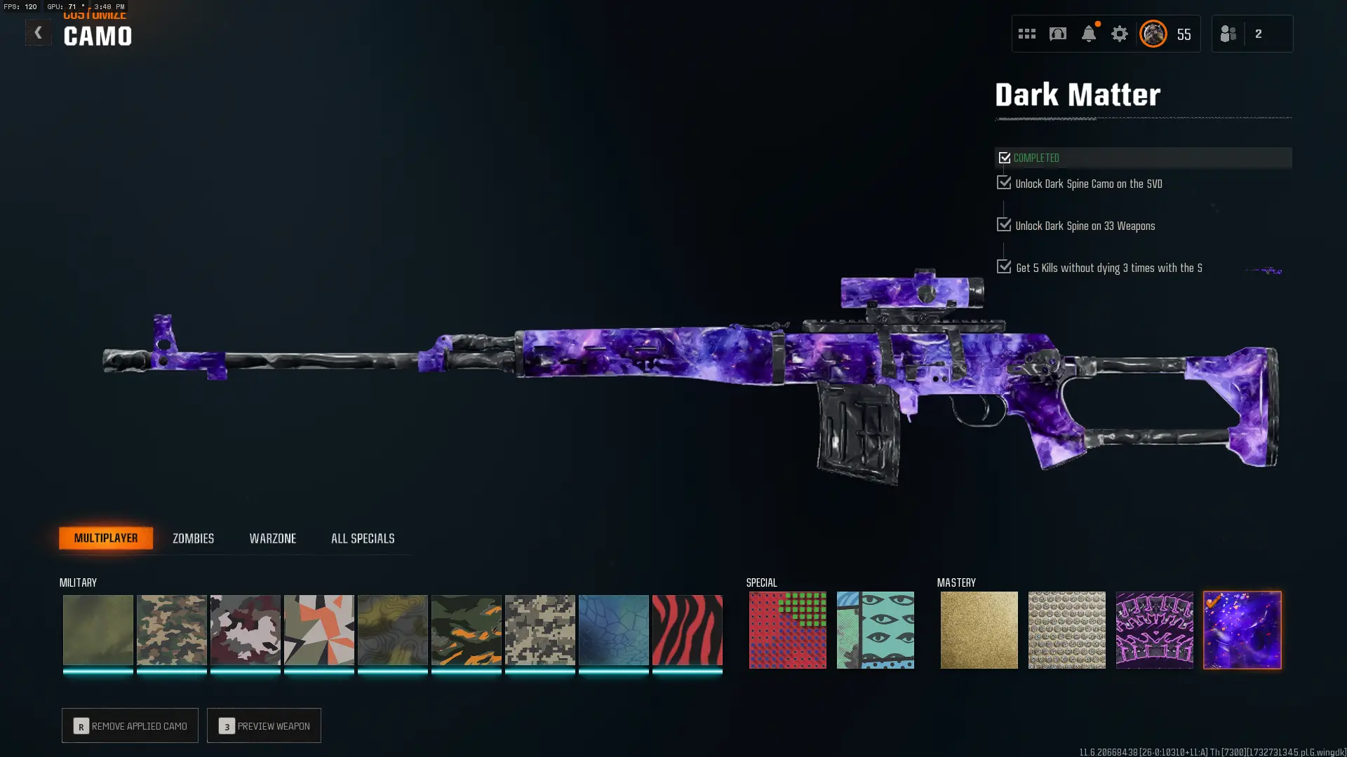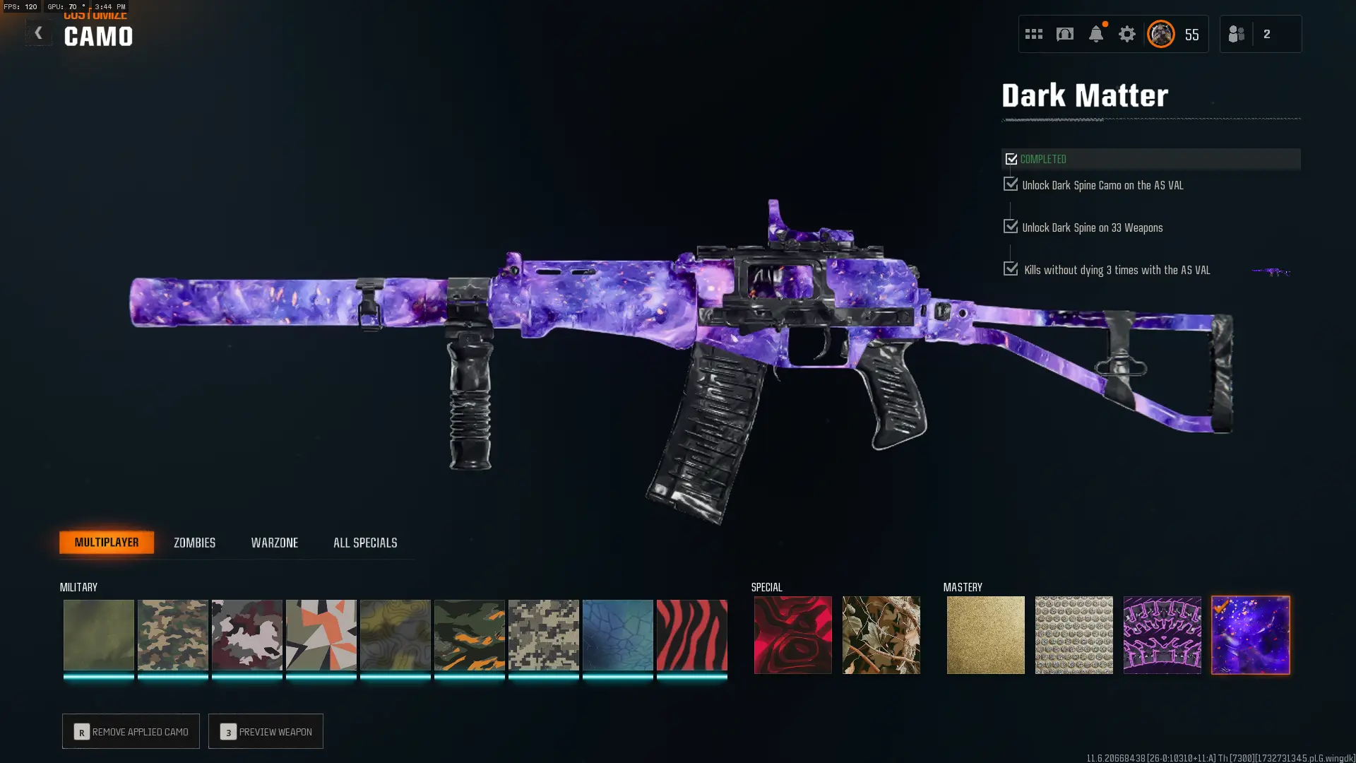 💎 BO6 & WZ4 ⭐prestige 5 33 Dark Matter 💎495 Camos 💎 Multiplayer Camos Are Unlocked on 33 Weapon⚔️ Level 55 🔥 16 Operators 🕸️ Dark Spine 💎 Diamond✨ Gold Camos 🦾 Prestige-Ready🦾 Linkable to: Steam, Battle.net, PSN, Xbox 🌐 Black Ops 6