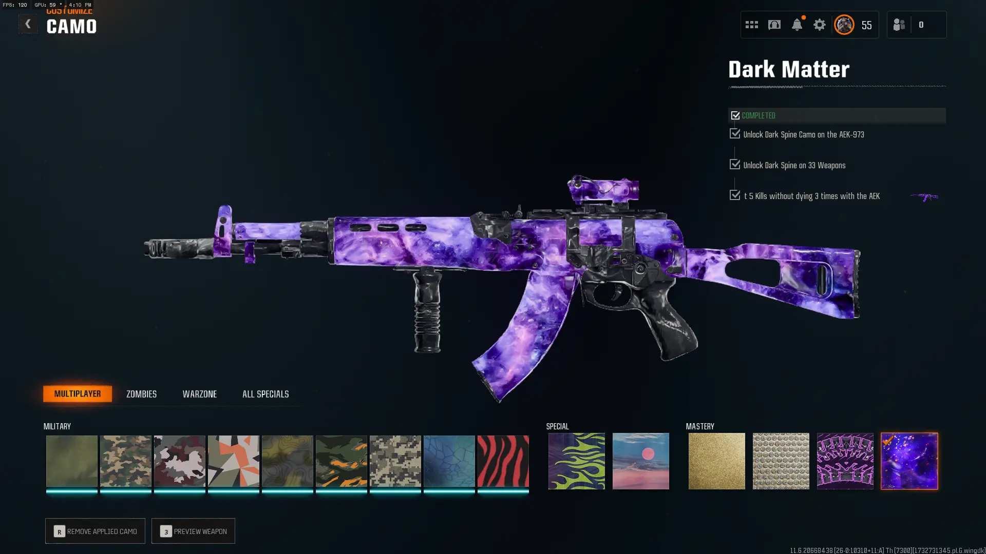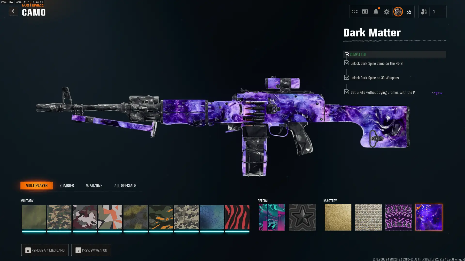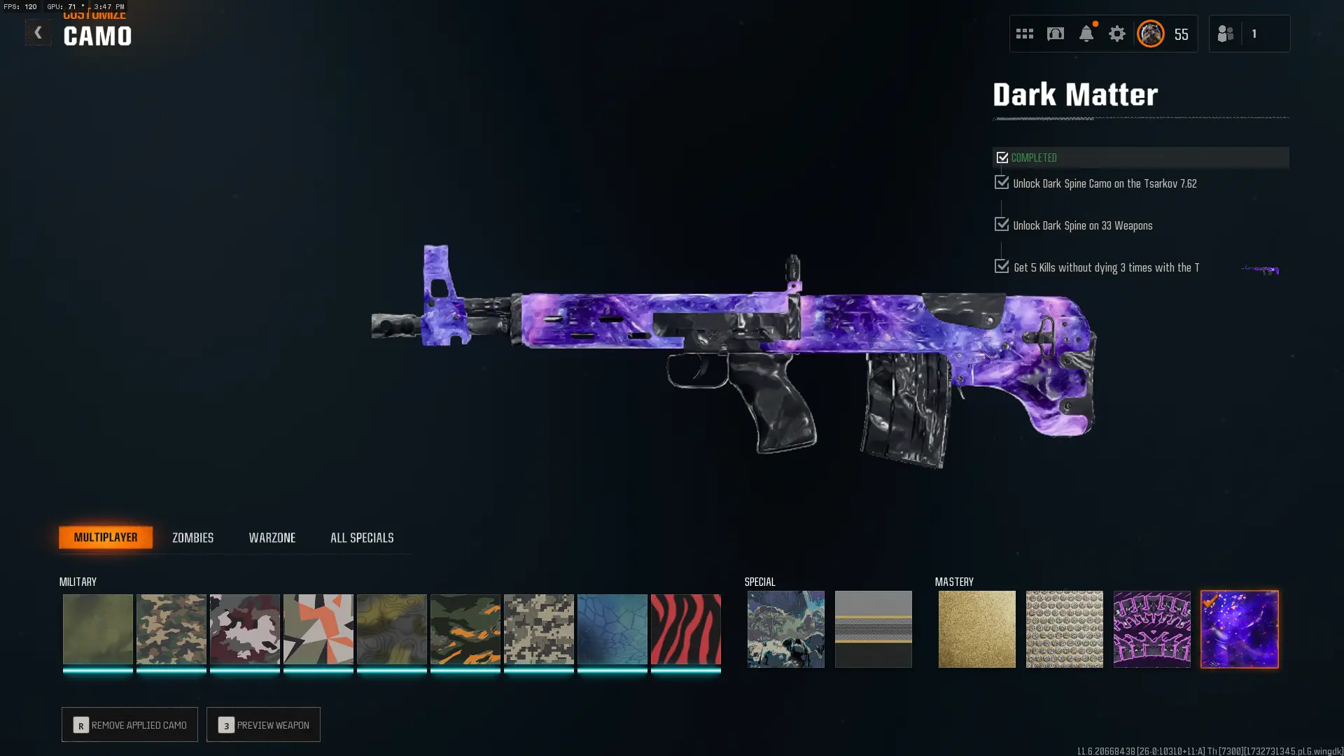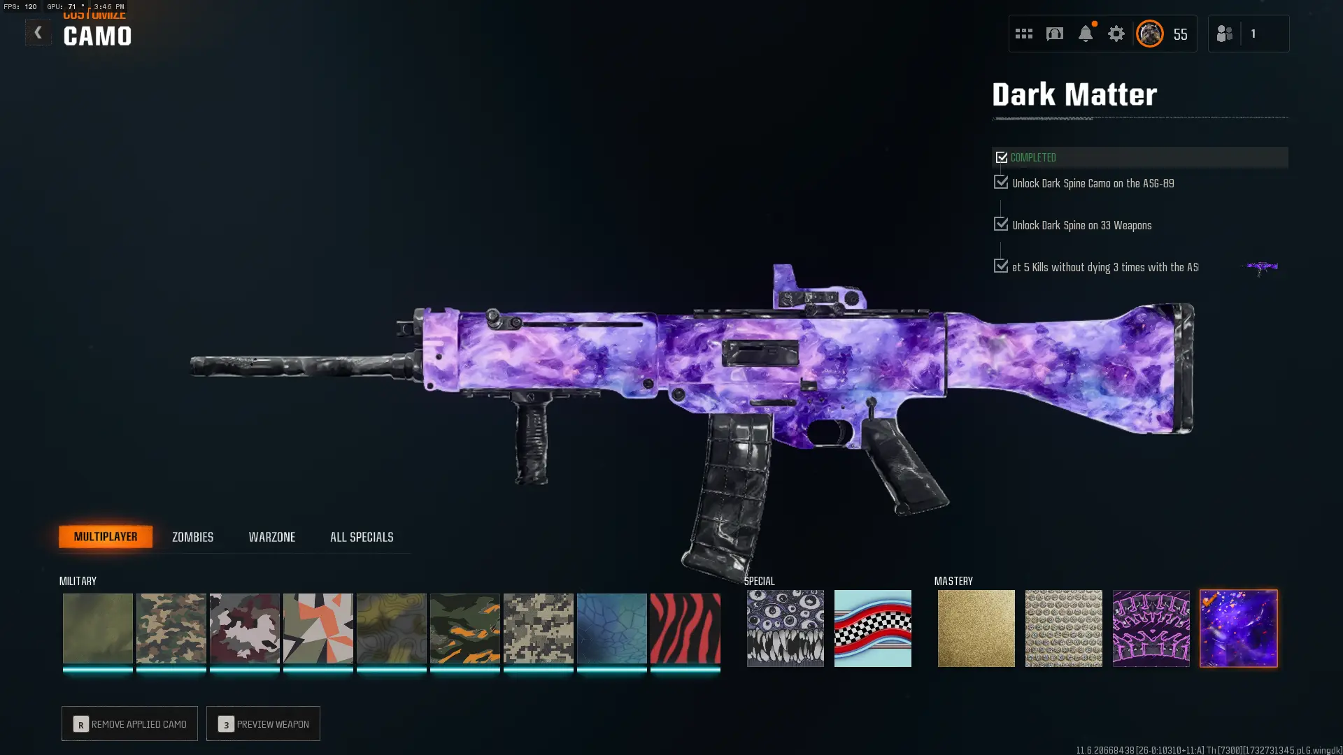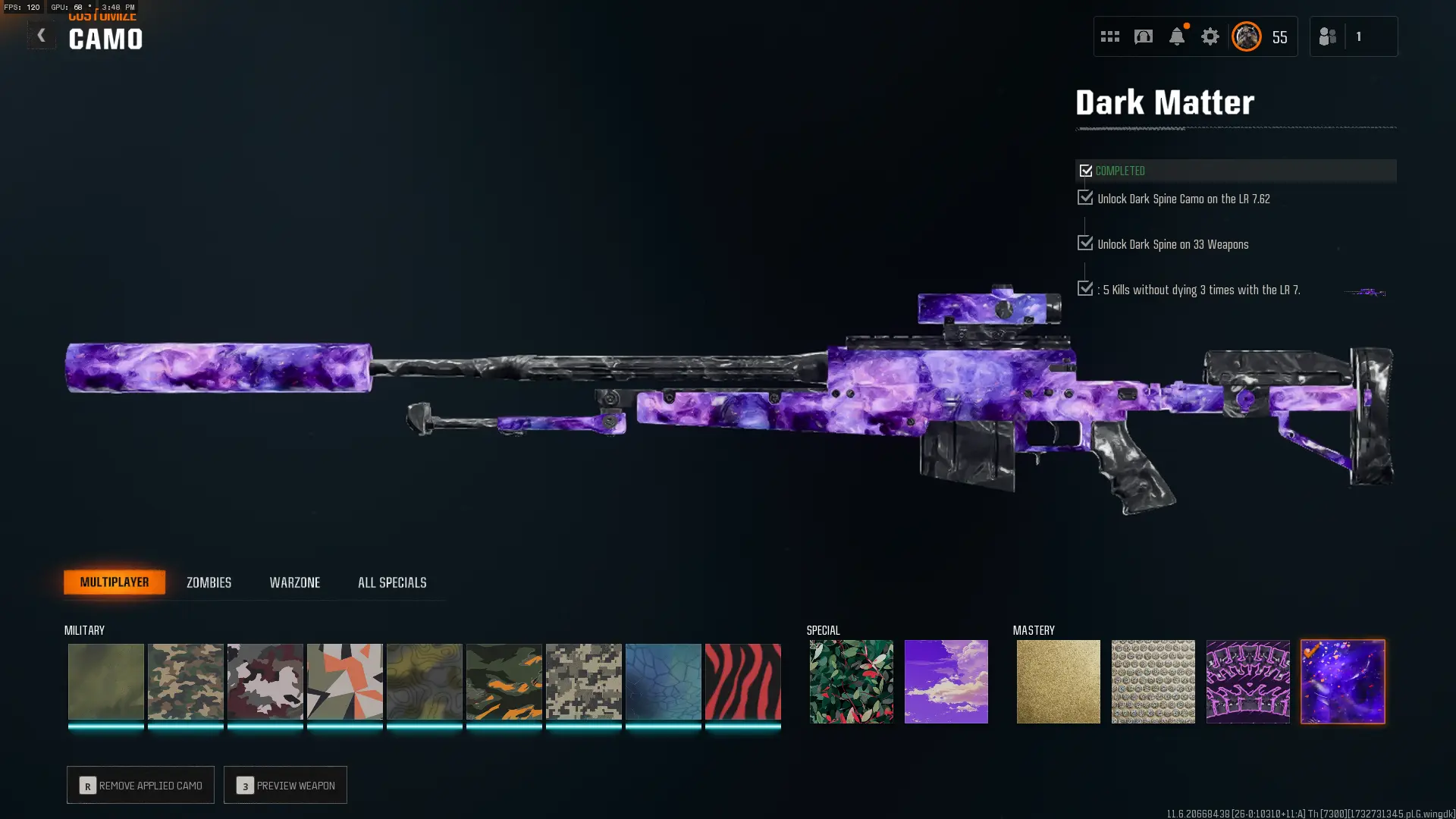 💎 BO6 & WZ4 ⭐prestige 5 33 Dark Matter 💎495 Camos 💎 Multiplayer Camos Are Unlocked on 33 Weapon⚔️ Level 55 🔥 16 Operators 🕸️ Dark Spine 💎 Diamond✨ Gold Camos 🦾 Prestige-Ready🦾 Linkable to: Steam, Battle.net, PSN, Xbox 🌐 Black Ops 6