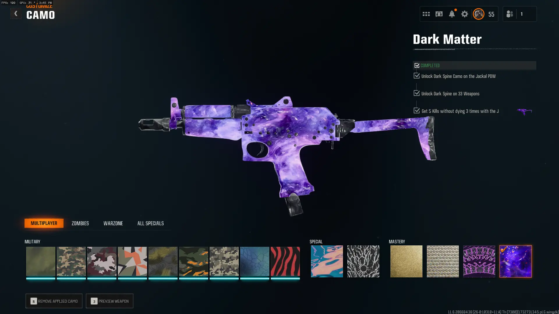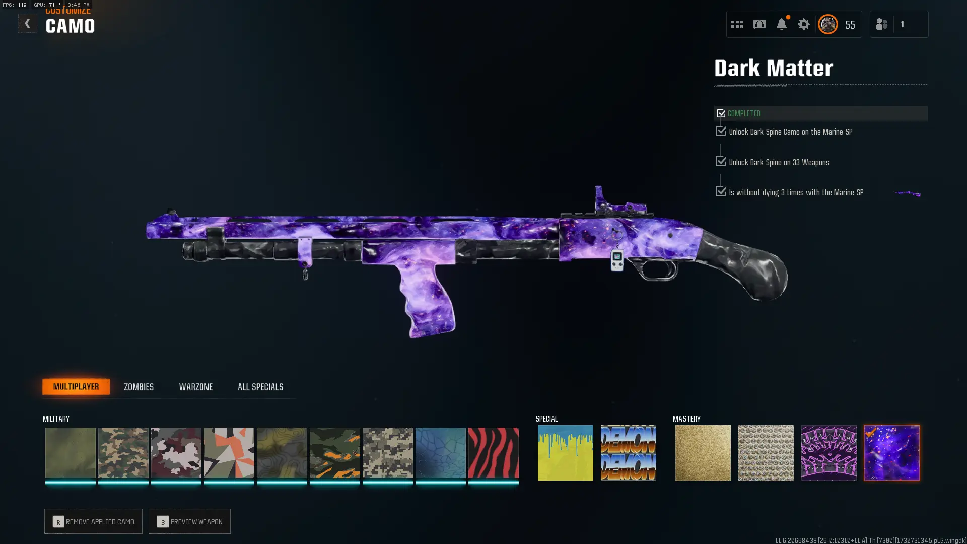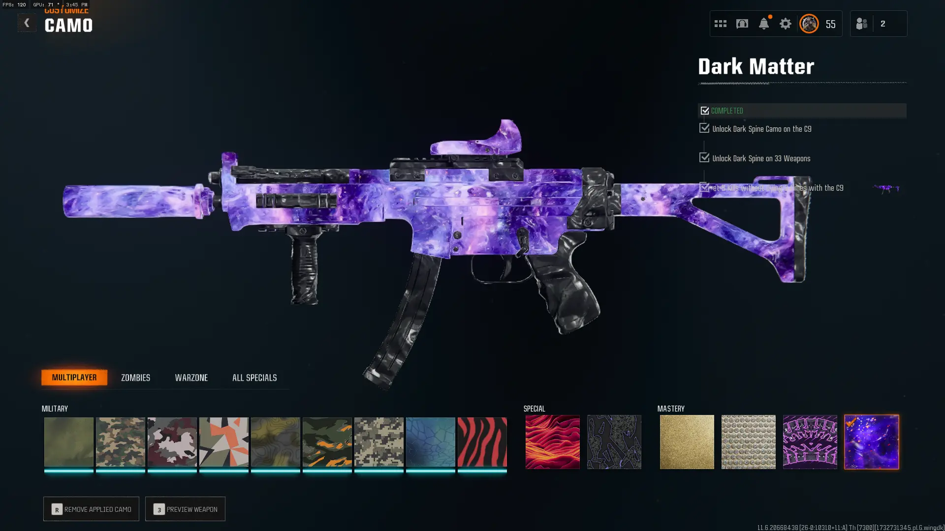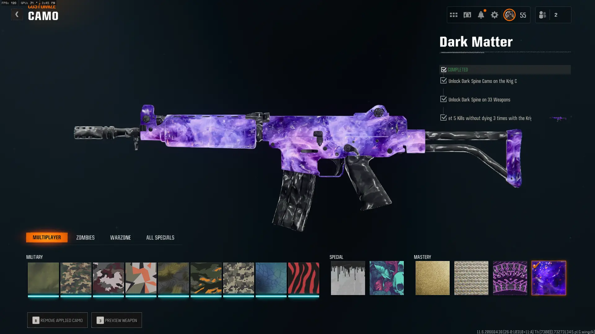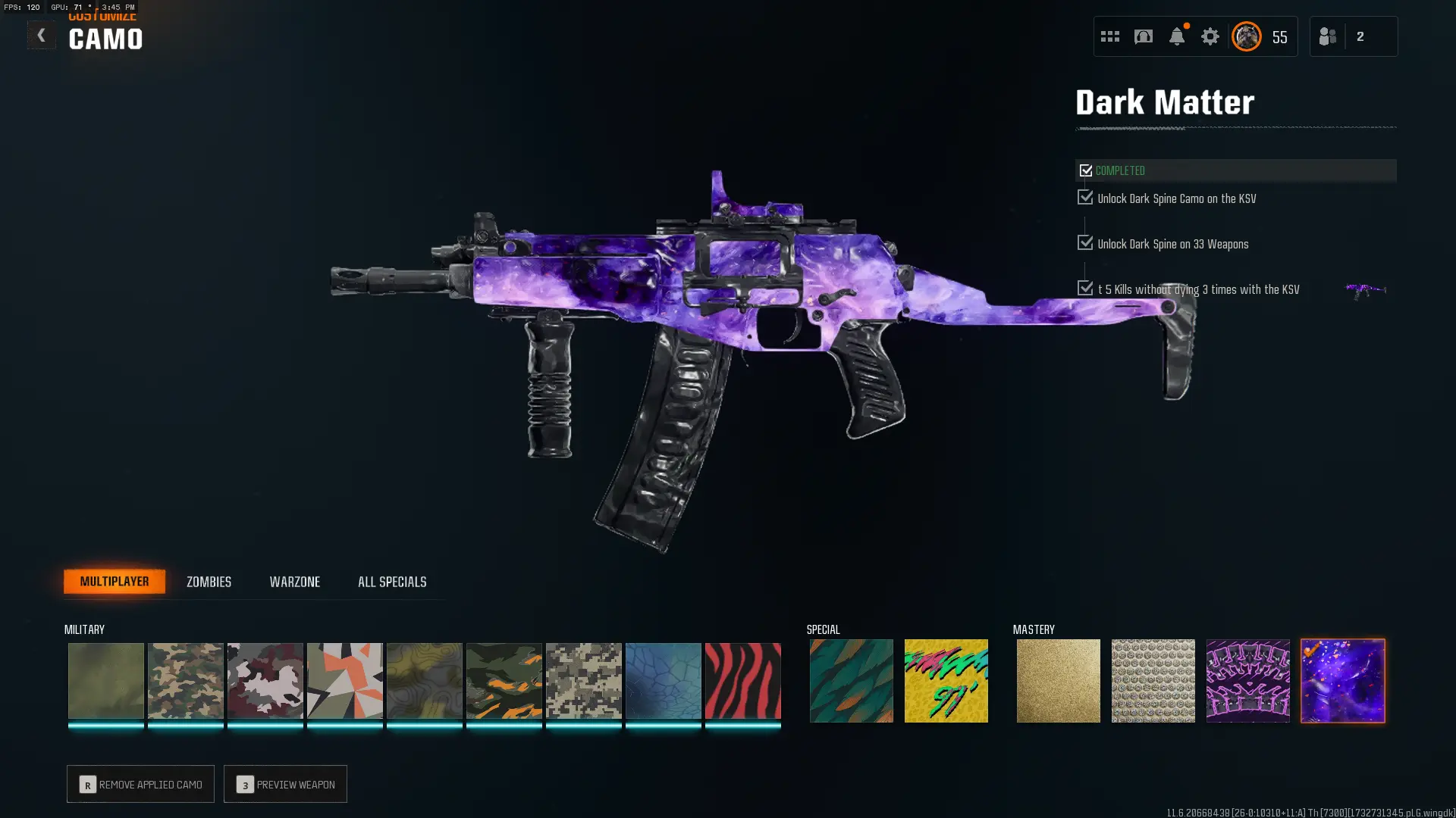💎 BO6 & WZ4 ⭐prestige 5 33 Dark Matter 💎495 Camos 💎 Multiplayer Camos Are Unlocked on 33 Weapon⚔️ Level 55 🔥 16 Operators 🕸️ Dark Spine 💎 Diamond✨ Gold Camos 🦾 Prestige-Ready🦾 Linkable to: Steam, Battle.net, PSN, Xbox 🌐 Black Ops 6