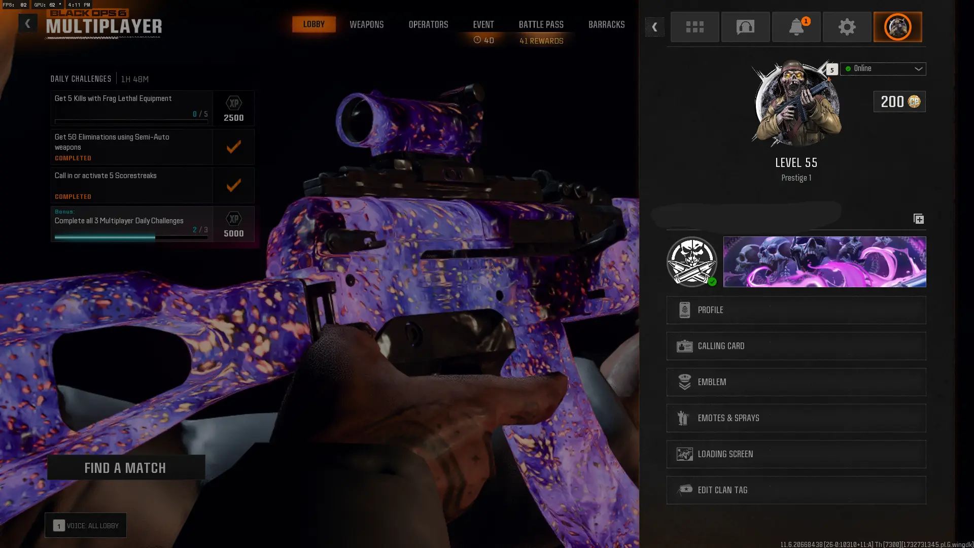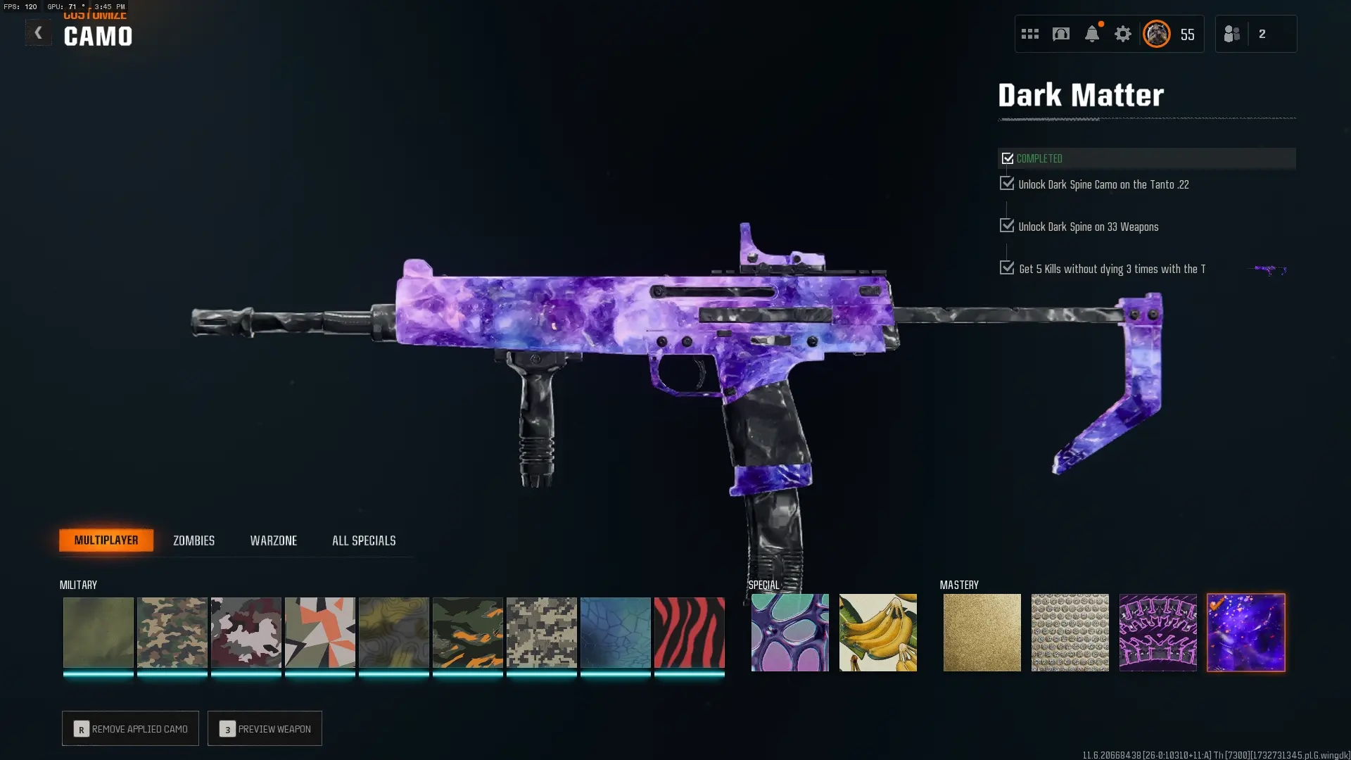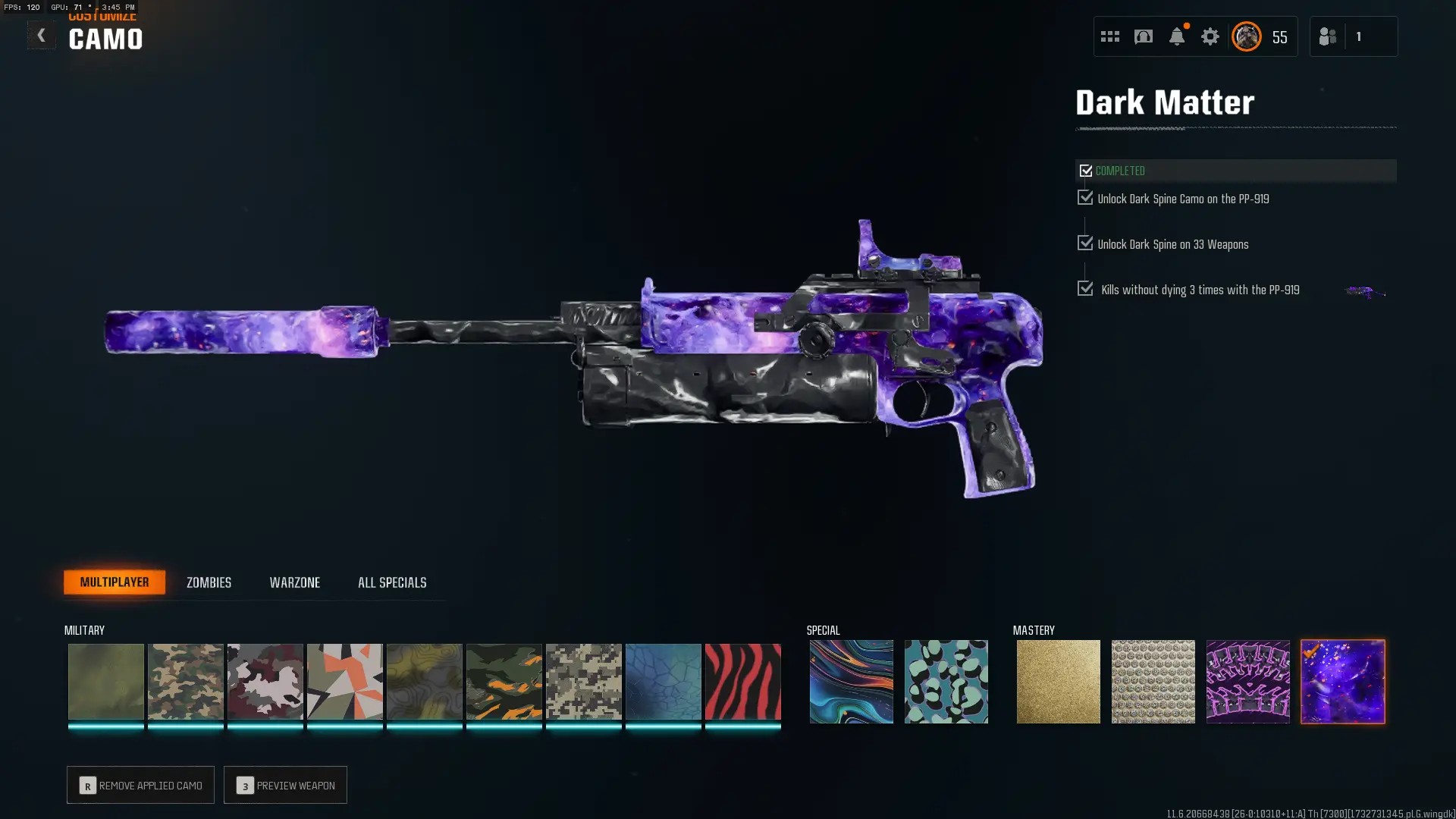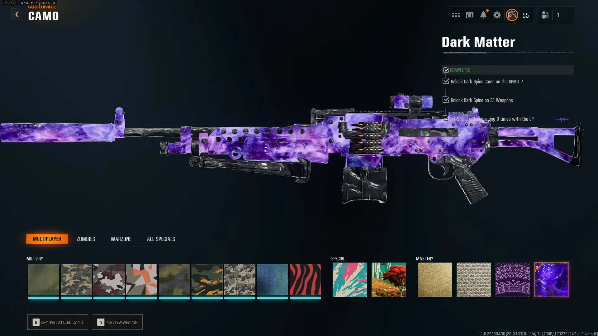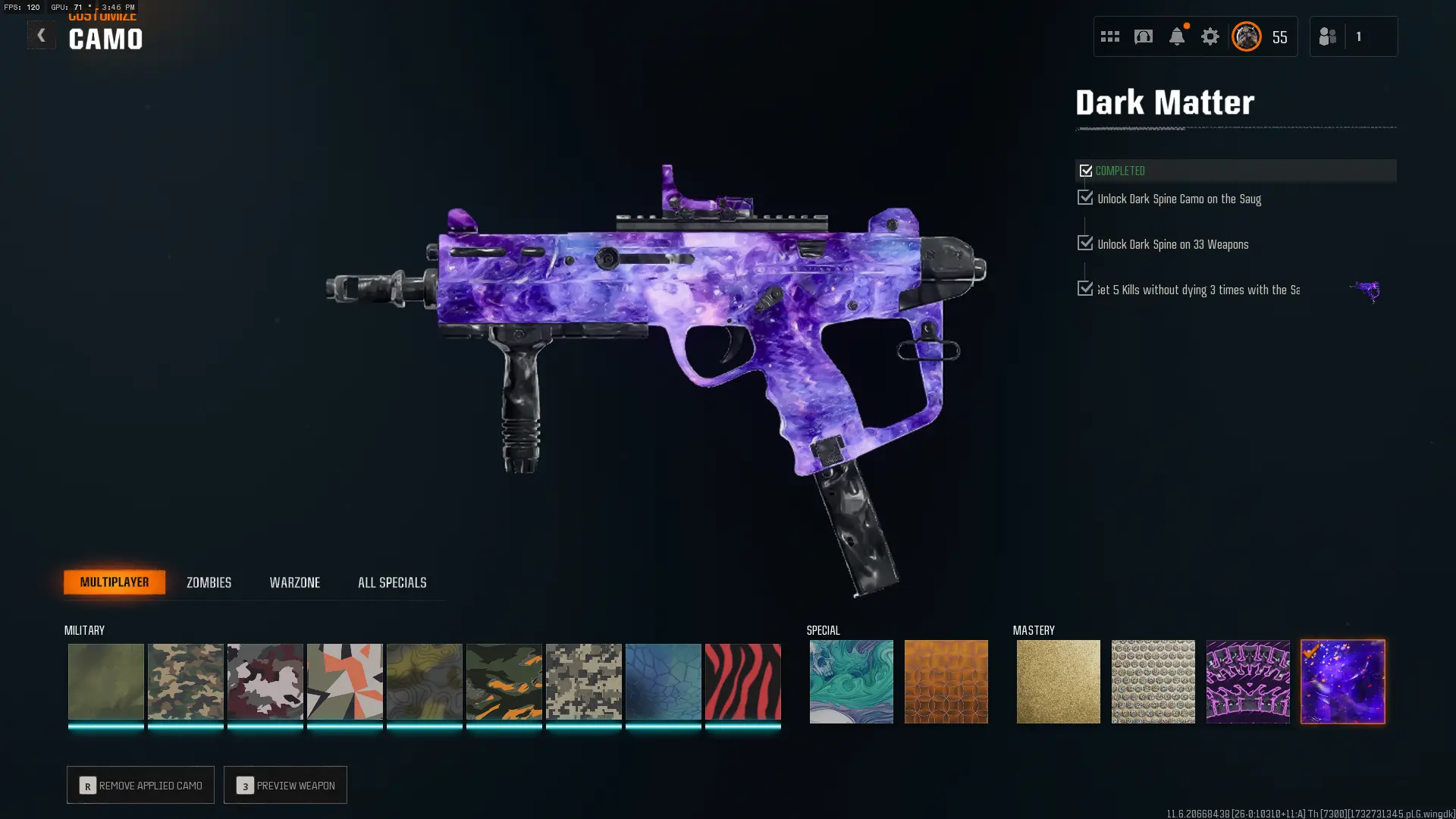 💎 BO6 & WZ4 ⭐prestige 5 33 Dark Matter 💎495 Camos 💎 Multiplayer Camos Are Unlocked on 33 Weapon⚔️ Level 55 🔥 16 Operators 🕸️ Dark Spine 💎 Diamond✨ Gold Camos 🦾 Prestige-Ready🦾 Linkable to: Steam, Battle.net, PSN, Xbox 🌐 Black Ops 6